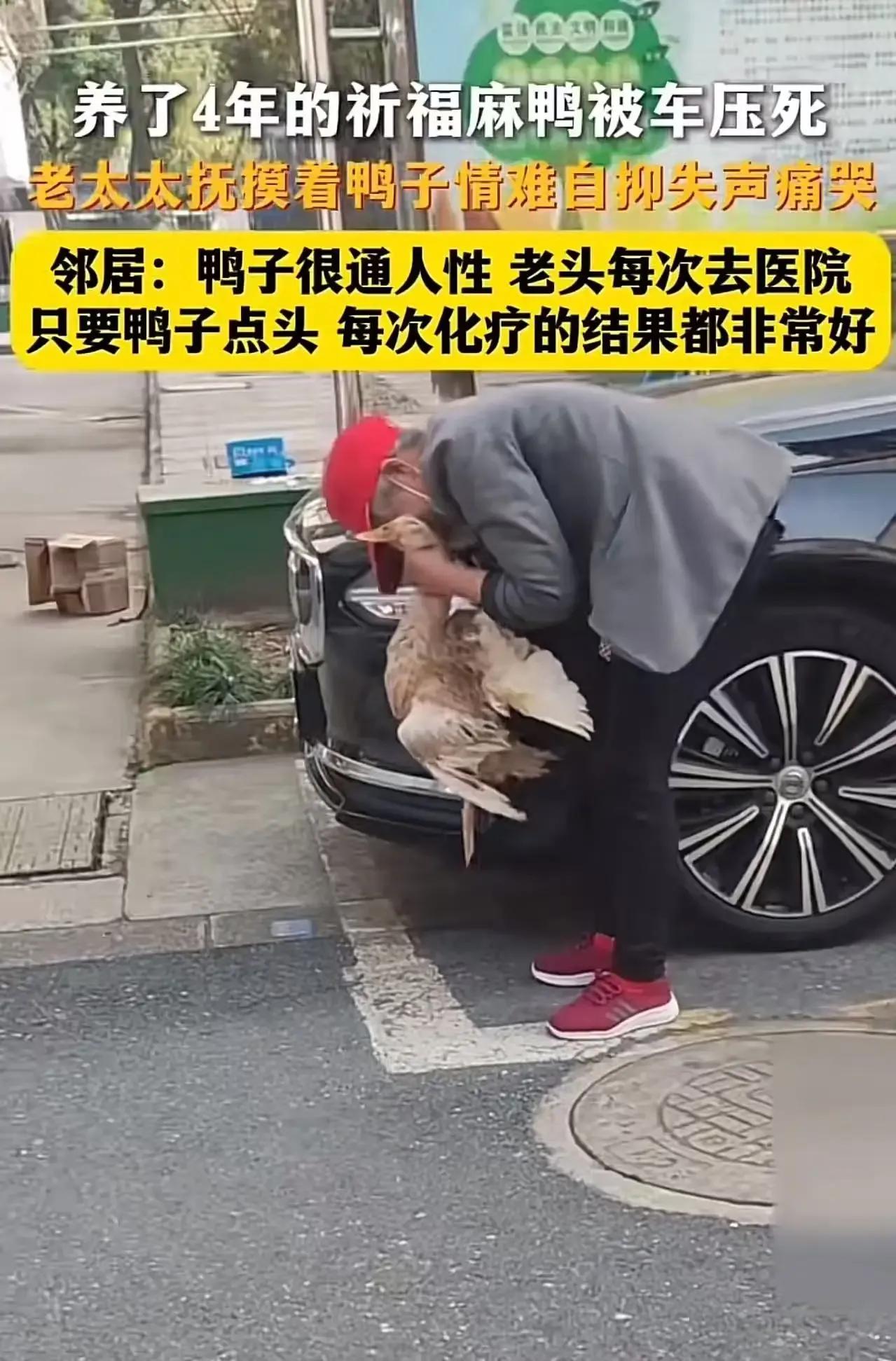江苏昆山发生了一件让人揪心的事,一位老太太养了4年的祈福麻鸭竟被车压死了,老太太当场抚摸着鸭子失声痛哭,这背后究竟有着怎样的故事呢? 据了解,这只麻鸭对老太太一家来说意义非凡。邻居透露,这鸭子非常通人性,每次老头去医院化疗,只要鸭子点头,似乎就预示着化疗结果会很好。这4年来,鸭子成了老太太老伴的精神寄托,也是他们生活中的一份温暖。然而,天有不测风云,这只承载着祈福与希望的麻鸭,却意外被车压死。老太太抚摸着鸭子,情难自抑,泪水夺眶而出。这一幕让在场的邻居都感到十分心疼,也引发了网友们的广泛关注和热议。大家纷纷表示,这不仅仅是一个简单的悲剧,更是一份深厚的感情寄托的消逝。对于老太太来说,失去的不仅仅是一只鸭子,更是一份陪伴、一份希望。 这起事件让我们看到了人与动物之间深厚的情感纽带,也让我们感受到了生命的脆弱与无常。希望大家能珍惜身边的每一个生命,也欢迎大家在评论区留言,分享你的看法和感受。苏州伤人事件 大麻鸭 太仓麻鸭 平江麻鸭 高邮湖摔车