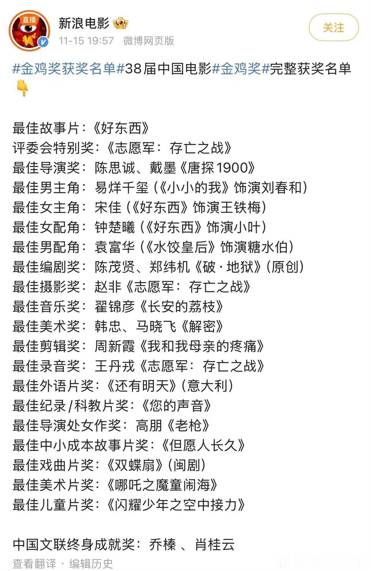 这届金鸡奖获奖,槽点很多,满腹脏话…… 女配其实跟去年女主情况类似,有强竞争力的压根没提名,虽然看完《好东西》我就觉得钟楚曦找到了人生角色,但拿最佳女配确实没多服众,最可惜的还是惠红英老师。 易烊千玺拿影帝应该是最没有悬念的,纵观颁奖期一整年这个表演也是相当突出,四提金鸡奖也是相当厉害了,拿了奖才发现这个影帝直接从80一代生递到00一代生手里,90一代生有的差! 咏梅和宋佳都拿过金鸡影后,谁拿都是二封,综合来看我觉得咏梅演技更加突出,更自然,但最后获奖的是宋佳,为咏梅感到可惜,出走的决心真的很好。 《好东西》最强最突出的编剧果然就丢了,最佳编剧给《破地狱》,这部探究人的生与死,还有东南亚家庭的缩影,是个沉重又不得不面对的现实话题。 最佳导演陈思诚?《唐探1900》?不夸张地说我刷到那一刻真的气笑了,看这个电影坐在电影院的时候,我真的第一次体会了坐立难安。 最佳影片总算给了《好东西》,可惜的是最该给的最佳编剧和最佳导演没给。 感觉金鸡奖就像是分猪肉但是分不均匀,该给的奖不给,不该给的乱给,真的有点水了,明年不看了。