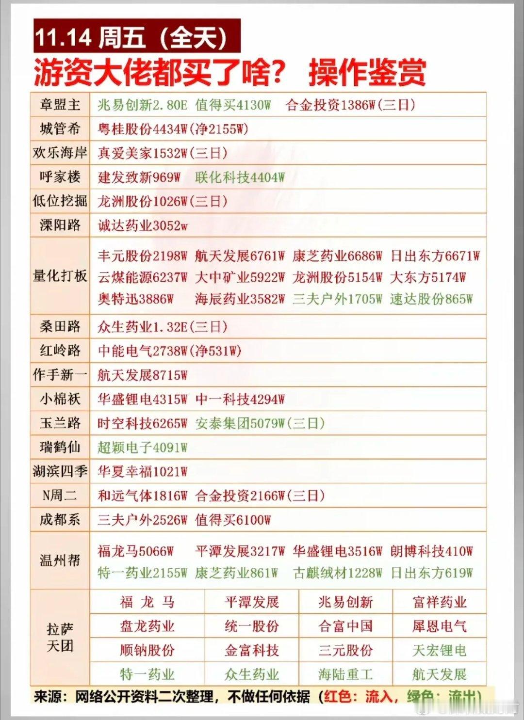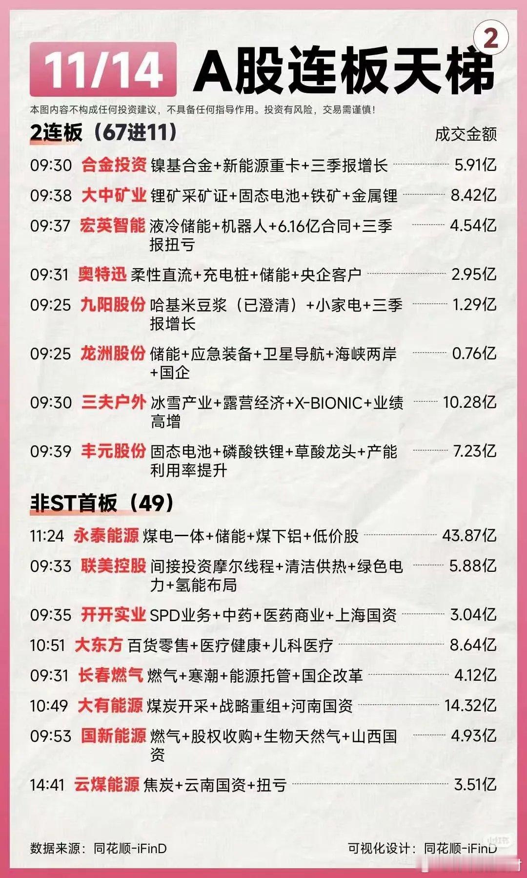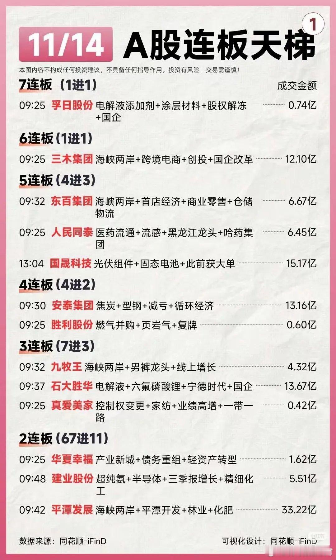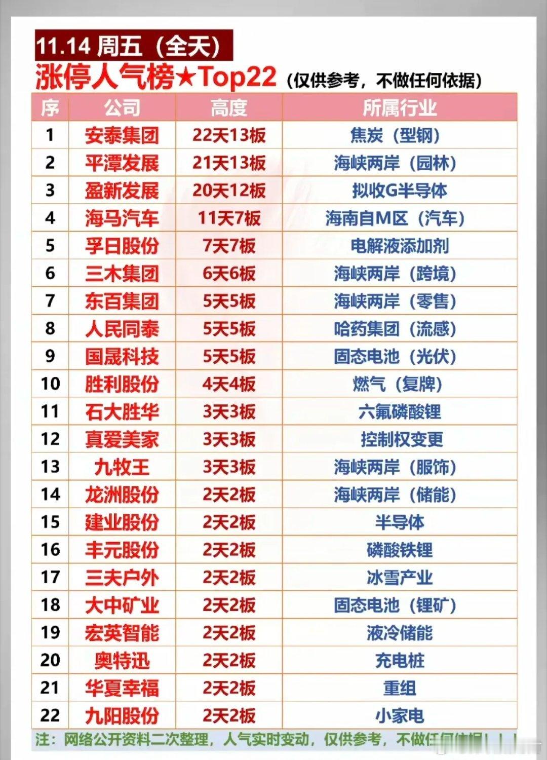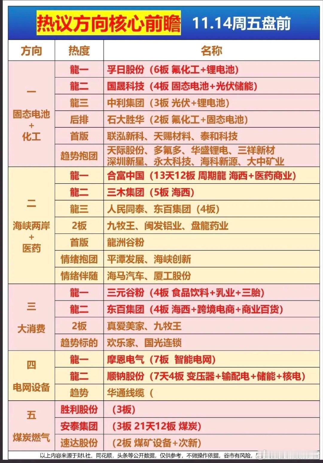 11月15日(周六)热门人气票点评一、连板高标组(狂欢中警惕分歧,滚动操作核心)1. 国晟科技:五日连板,热度高涨,需盯紧量能持续性。2. 人民同泰:五连封板,强势延续,建议设止盈防护。3. 孚日股份:七连涨停,高位现分歧,优先滚动落袋。4. 东百集团:五连封板,筹码健康,宜滚动止盈留底仓。5. 三木集团:六板开闸,分歧释放,边打边撤不追高。6. 合富中国:停牌核查,警惕复牌情绪回落,观察承接力再操作。7. 真爱美家:三连涨停,资金承接积极,可继续格局(关注次日量能)。8. 华夏幸福:双连一字板,地产链预期加持,持股待涨(开板放量减仓)。9. 胜利股份:四连涨停,逢高降仓锁定利润,规避高位风险。二、强势趋势组(资金+景气支撑,逢低可布局)1. 大有能源:老龙新板,煤炭板块协同,后续看高,回调轻仓跟进。2. 盛新锂能:量价齐升,锂电景气加持,机构加仓,趋势向好持有。3. 多氟多:震荡上扬,趋势未改,受益锂电需求,逢低布局。4. 天赐材料:震荡上行,机构净买入,适合高抛低吸做波段。5. 摩恩电气:强势回踩,十日均线支撑,逢低吸纳性价比高。6. 联美控股:直线拉升涨停,动能充足,可轻仓跟进博弈延续。7. 大中矿业:稳步上涨,量价配合良好,持有享受趋势红利。8. 石大胜华:快速涨停,锂电材料供需偏紧,短期继续持有。9. 特一药业:震荡上行,机构承接有力,持股拿稳为主。三、震荡调整组(观望为主,等待明确信号)1. 北方稀土:低位震荡,量能不足,观望至放量突破。2. 平潭发展:如期涨停,需看板块协同,观察次日量能再定。3. 三维通信:横盘箱体整理,暂无突破信号,等待箱体区间机会。4. 格尔软件:走势平稳,震荡为主,缺乏资金关注,优先观望。5. 赣锋锂业:今日回调,锂电景气未改,有望企稳,小仓位试错(破支撑止损)。6. 大众公用:拐点初现,量能温和放大,等待放量突破再介入。7. 闻泰科技:缩量整理,半导体景气延续,等待放量启动信号。8. 香农芯创:强势调整,十日均线支撑有效,关注均线附近低吸。9. 山东墨龙:冲高后依托五日均线,守住支撑持股,破位离场。10. 工商银行:稳步上升,符合大金融护盘逻辑,长期布局可继续格局。四、风险警示组(果断规避,警惕回调加深)1. 工业富联:趋势下行,资金持续流出,先走为上。2. 东方财富:调整趋势明确,券商板块低迷,观望两日待止跌。3. 三夫户外:巨量封板暗藏分歧,及时止盈锁定利润。4. 天际股份:缩量调整,机构净卖出,且战且退。5. 数据港:弱势封板,谨防诱多,不盲目追高。6. 值得买:尾盘拉升疑似出货,警惕次日回调。7. 隆基绿能:反弹无力,光伏板块分化,建议止盈止损。8. 卧龙电驱:破位调整,趋势下行,无信号坚决规避。9. 中际旭创:低开低走,弱势难改,资金流出明显,回避。10. 万向钱潮:光脚长阴,技术破位,警惕回调加深。11. 神州信息、东方精工、凯美特气:均处破位下行趋势,资金出逃,坚决规避不抄底。操作提示本周赚钱效应集中于连板股及锂电、科技制造、国企改革赛道,机构与北向资金加仓硬科技、顺周期板块。下周重点关注高标分歧、锂电产业链价格及主线延续性,操作遵循“弃弱留强、不追高、不抄底”原则。个人观点,仅供参考!不作为投资建议。欢迎点赞、收藏加关注,不迷路!