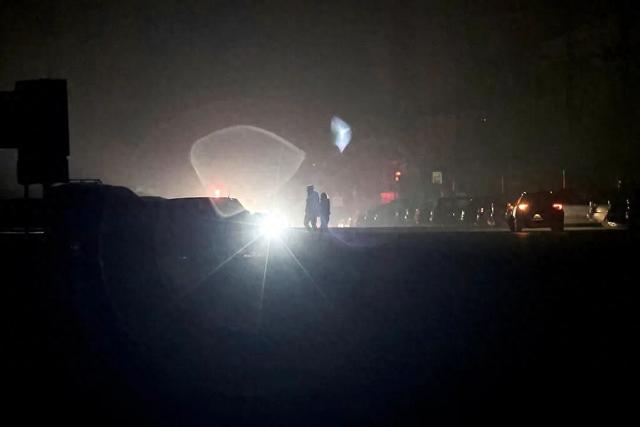 当地时间2025年11月8日,乌克兰哈尔科夫,人们在车头灯的照耀下过马路。由于俄罗斯军队对乌克兰东北部城市能源基础设施进行大规模炮击,数十条街道和社区的电力供应中断。视觉中国图