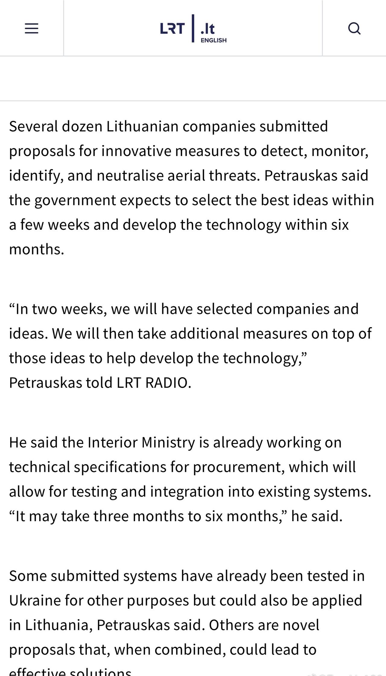 立陶宛國家廣播電視台(LRT):立陶宛經濟部副部長Paulius Petrauskas 彼得勞斯卡斯表示,立陶宛正迅速發展相關技術,以應對近期來自白俄羅斯的smuggling balloons和無人機湧入立陶宛的情況。 數十家立陶宛公司提交了關於探測、監測、識別和消除空中威脅的創新措施提案。 佩特勞斯卡斯表示,政府預計在幾週內選出最佳方案,並在六個月內開發出相關技術。