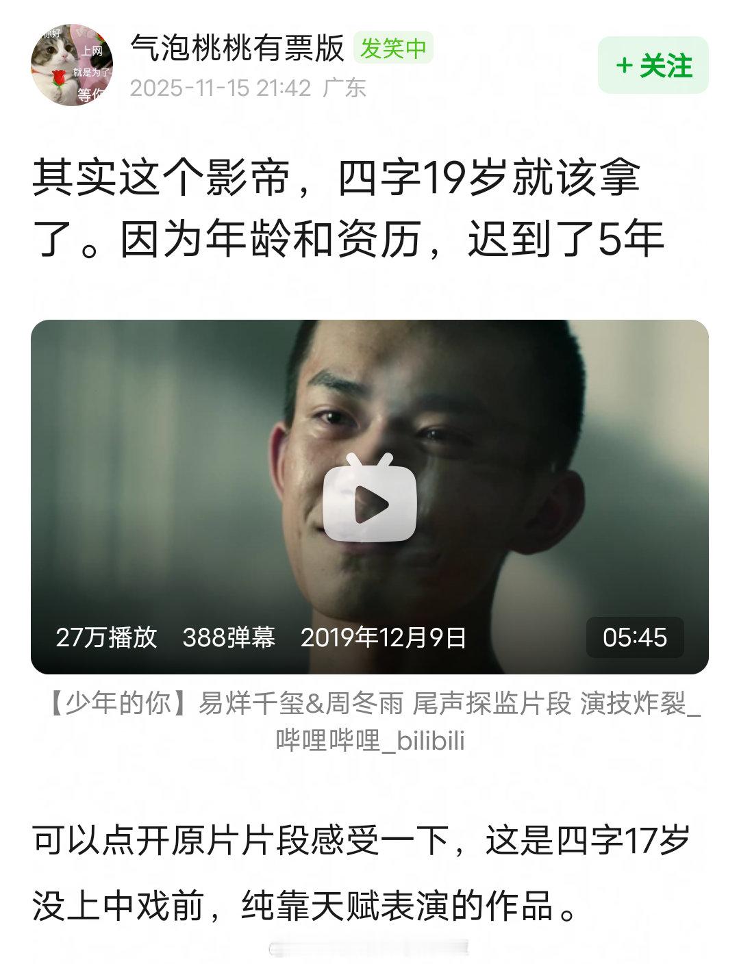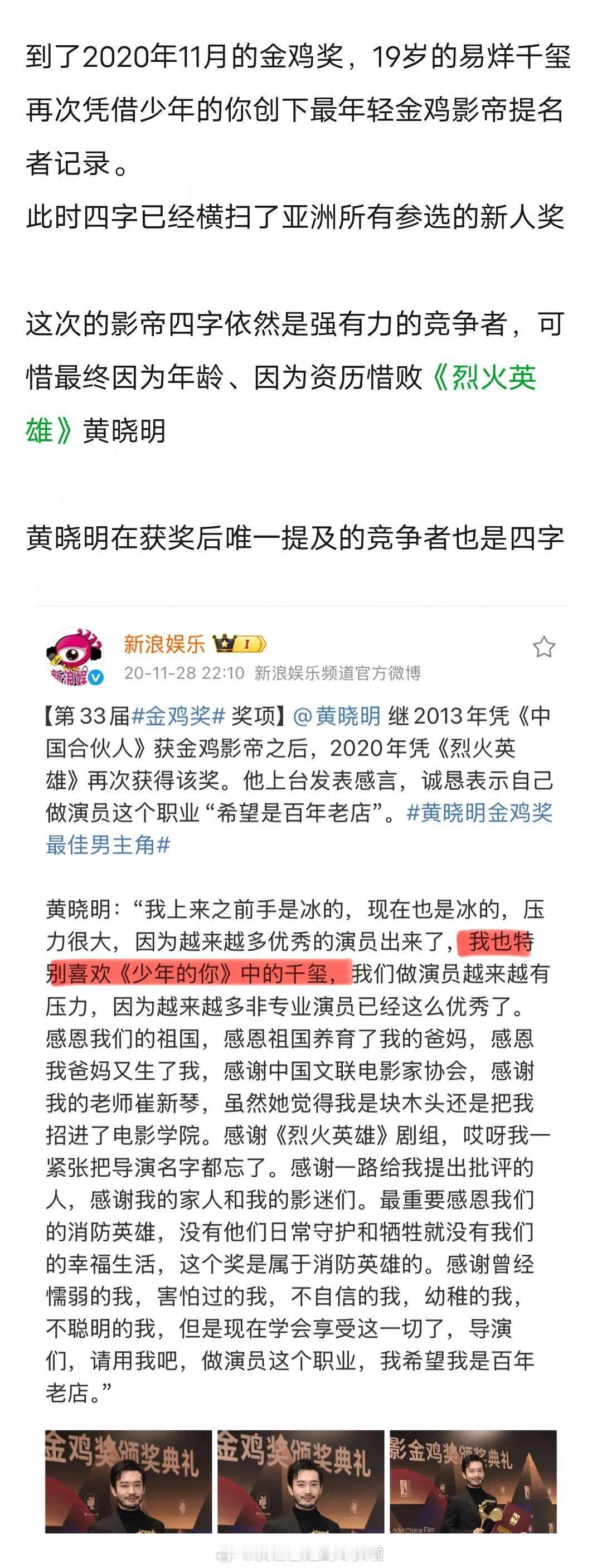 其实易烊千玺《少年的你》就该拿影帝了吧,金像奖败给70岁的香港演员,金鸡奖败给黄晓明的烈火英雄。19岁就该拿的奖,因为年龄和资历,迟到了5年。