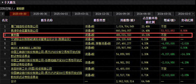注:截至三季度末,黄世霖持有宁德时代10.21%股份,为公司的第三大股东。宁德时代今日收盘价为404.12元/股,以此计算,黄世霖转让的股份市值约184.41亿元。