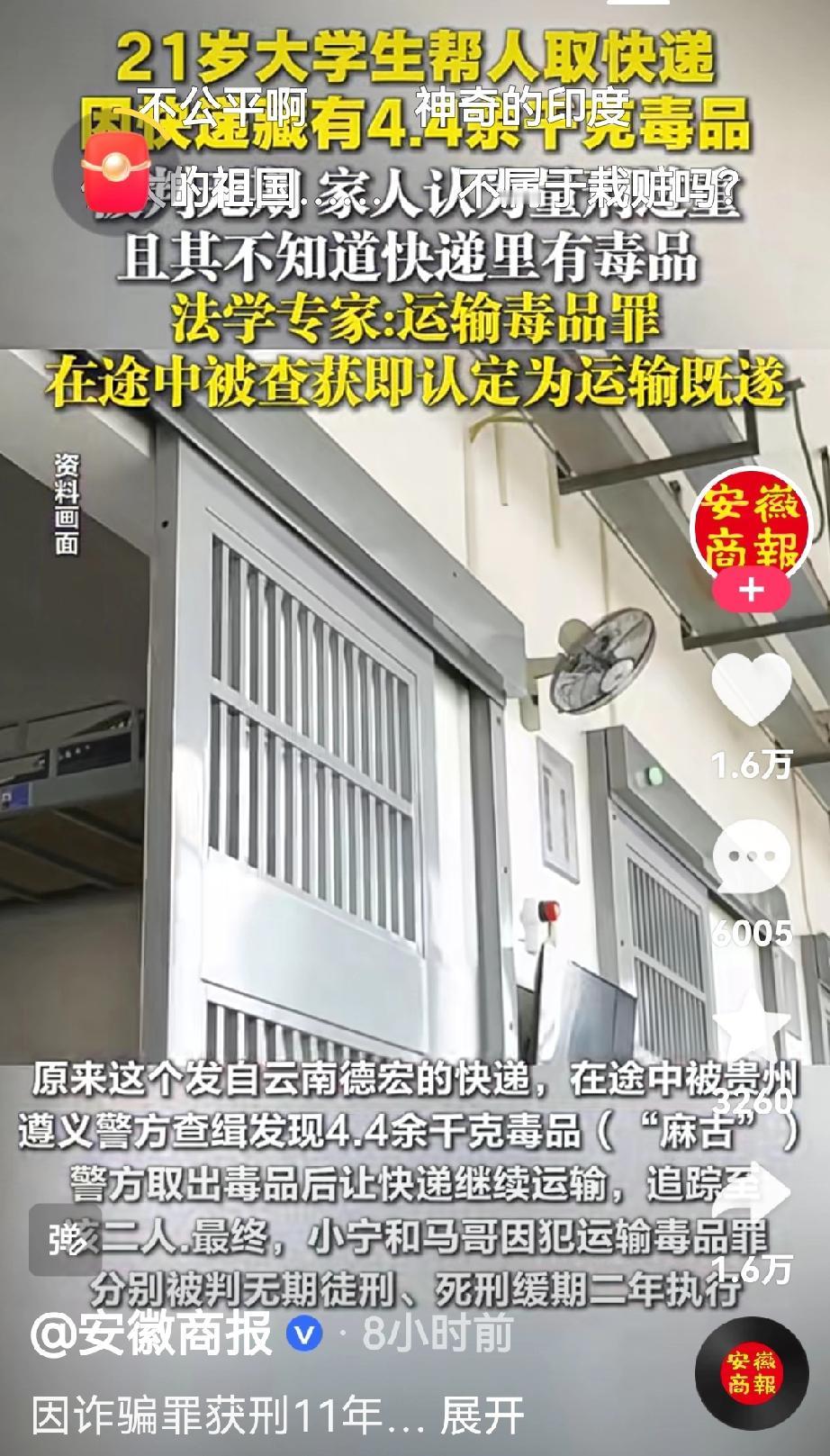 21岁女大学生帮人取快递,因快递内藏有毒品,被判处无期徒刑。关键应该看女大学生是否知道快递内是否藏有毒品?如果知道有毒品是罪有应得,如果不知道应该无罪。因为收件的无罪,运件的无罪,存件的无罪,送件的无罪,只有取件的有罪,这不公平。如果取件的不知情有罪,那么收件的,运件的,存件的,送件的不知情也都应该有罪,这是一个过程的多个环节,不能只是其中的一个环节有罪,其它的环节却没有罪。法律不能只选择性定罪。