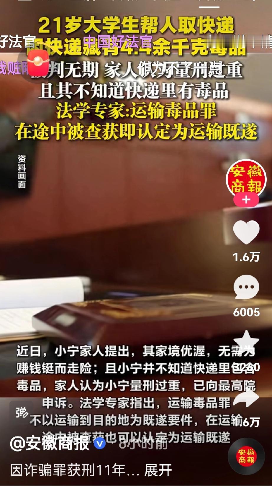 21岁女大学生帮人取快递,因快递内藏有毒品,被判处无期徒刑。关键应该看女大学生是