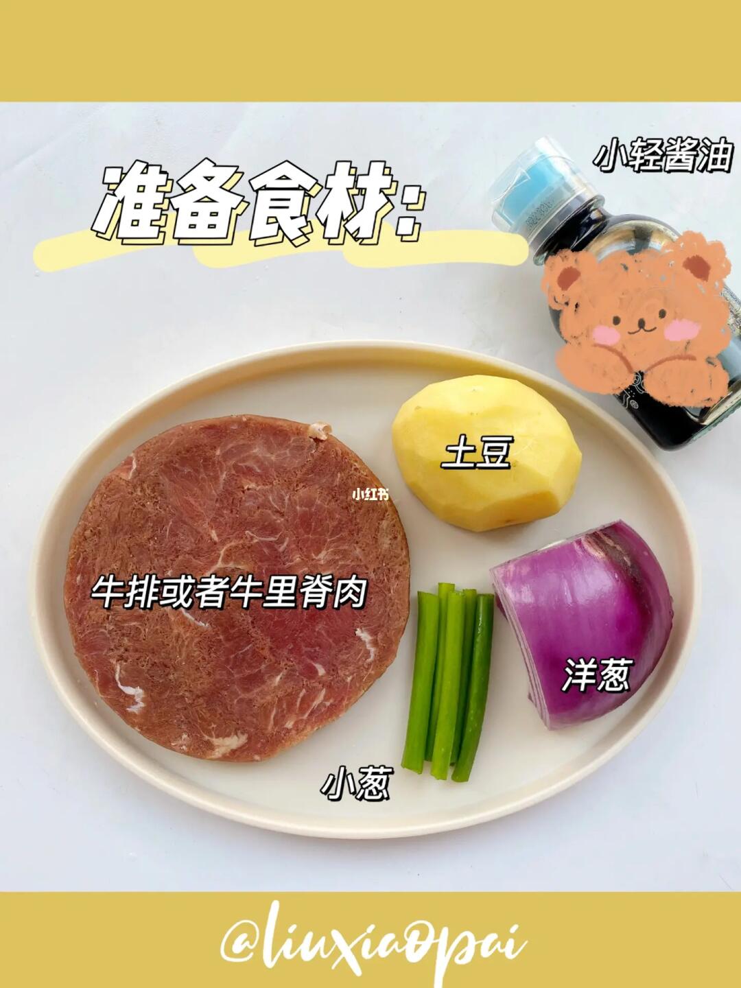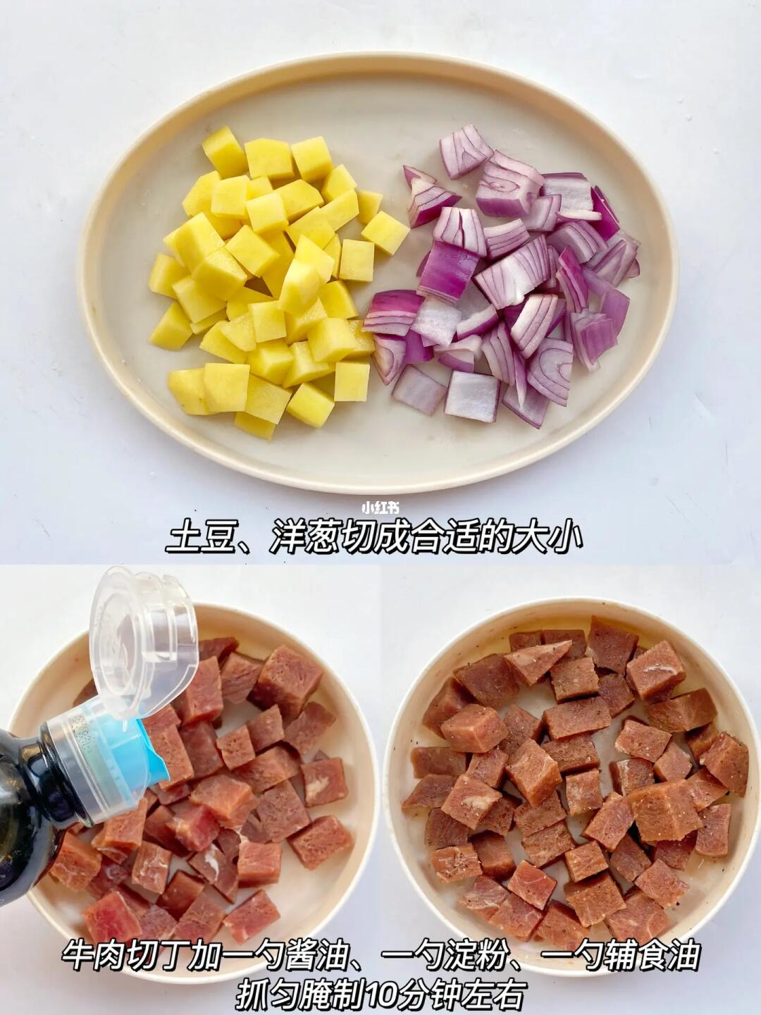 1⃣️洋葱、土豆切成合适的大小。牛肉切成丁加一勺小轻酱油、一勺淀粉和辅食油抓匀腌制10分钟。用小轻酱油提前腌制一下,牛肉也会更加入味哦,它含盐量少,吃起来不重口。只有简单的4种配料,给宝宝吃着也放心。