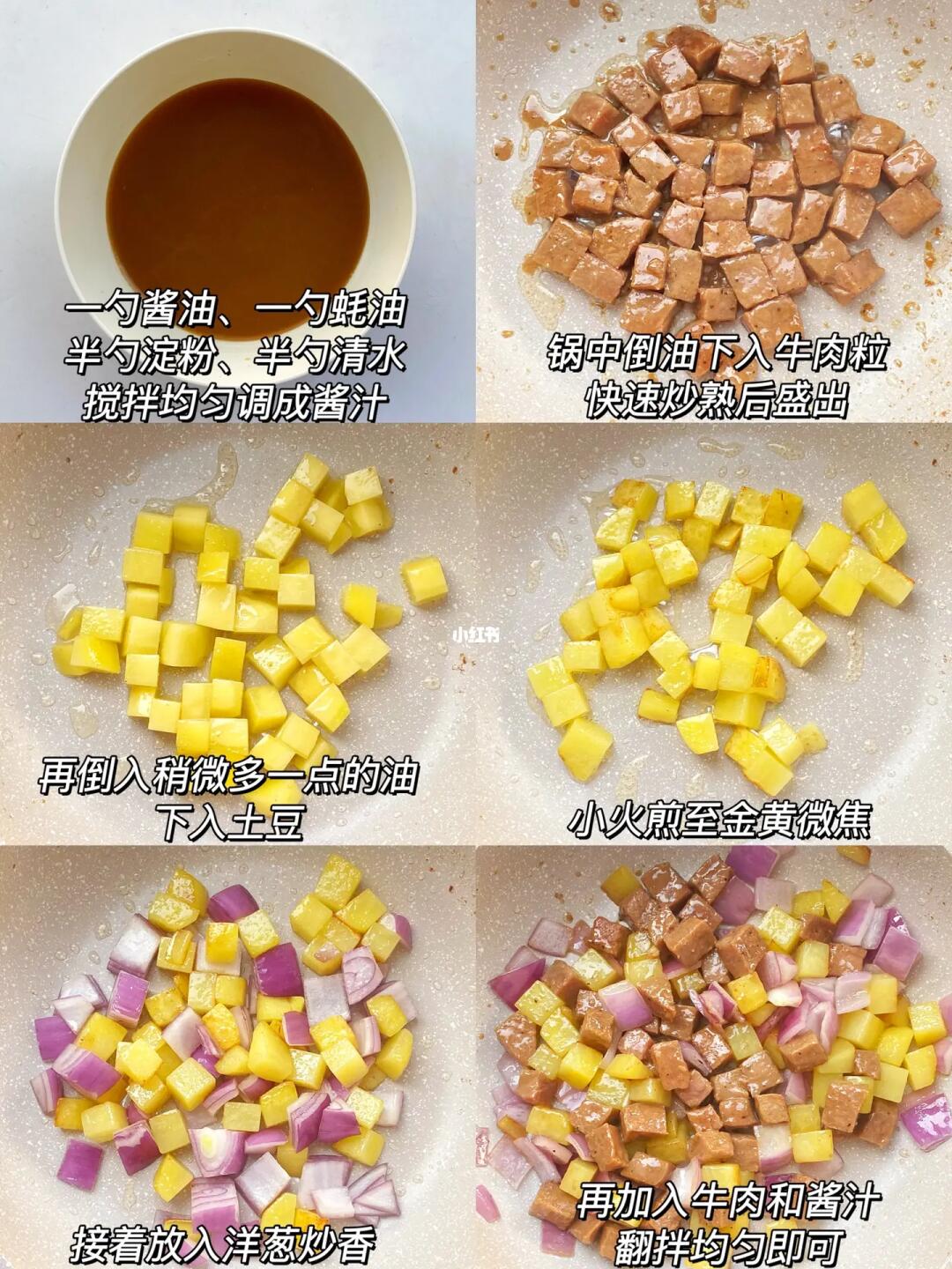 4⃣️另起锅倒入稍微多一点的油,下入土豆小火煎至表面微焦,要小火慢慢煎熟哦。下入洋葱炒香,再下入牛肉和酱汁,翻拌均匀出锅。
