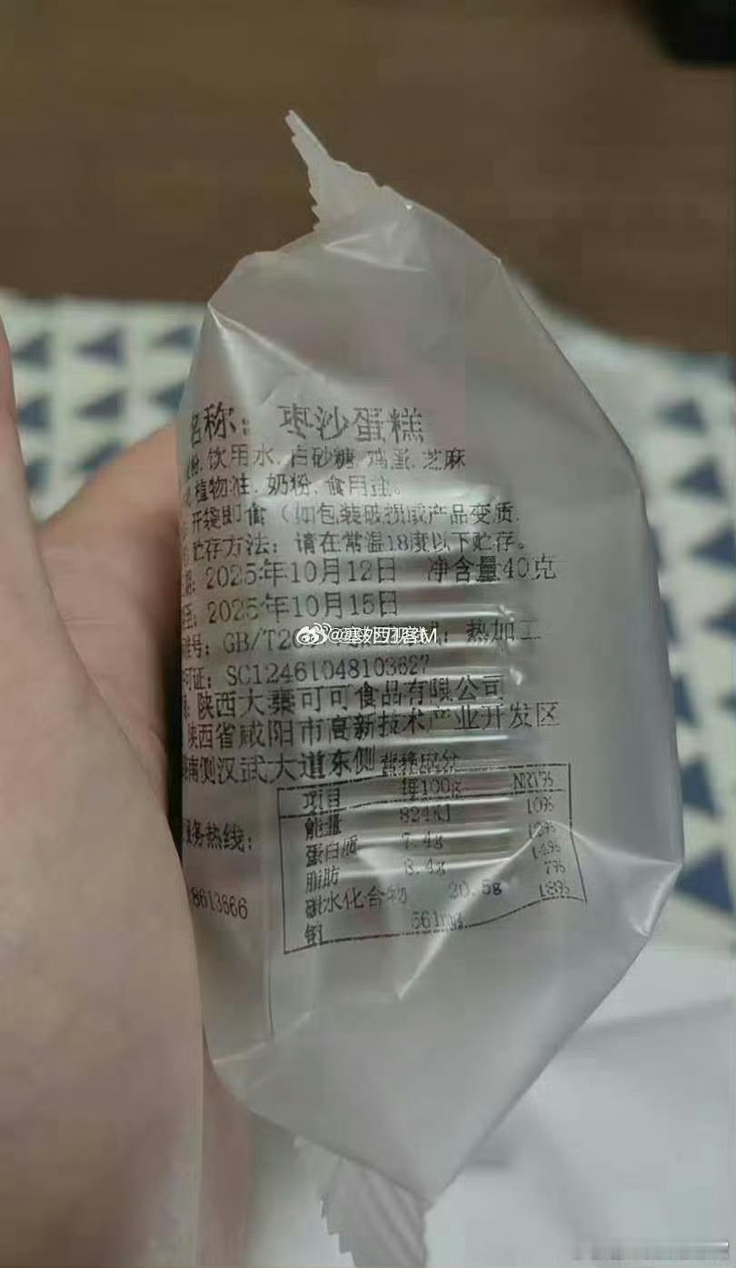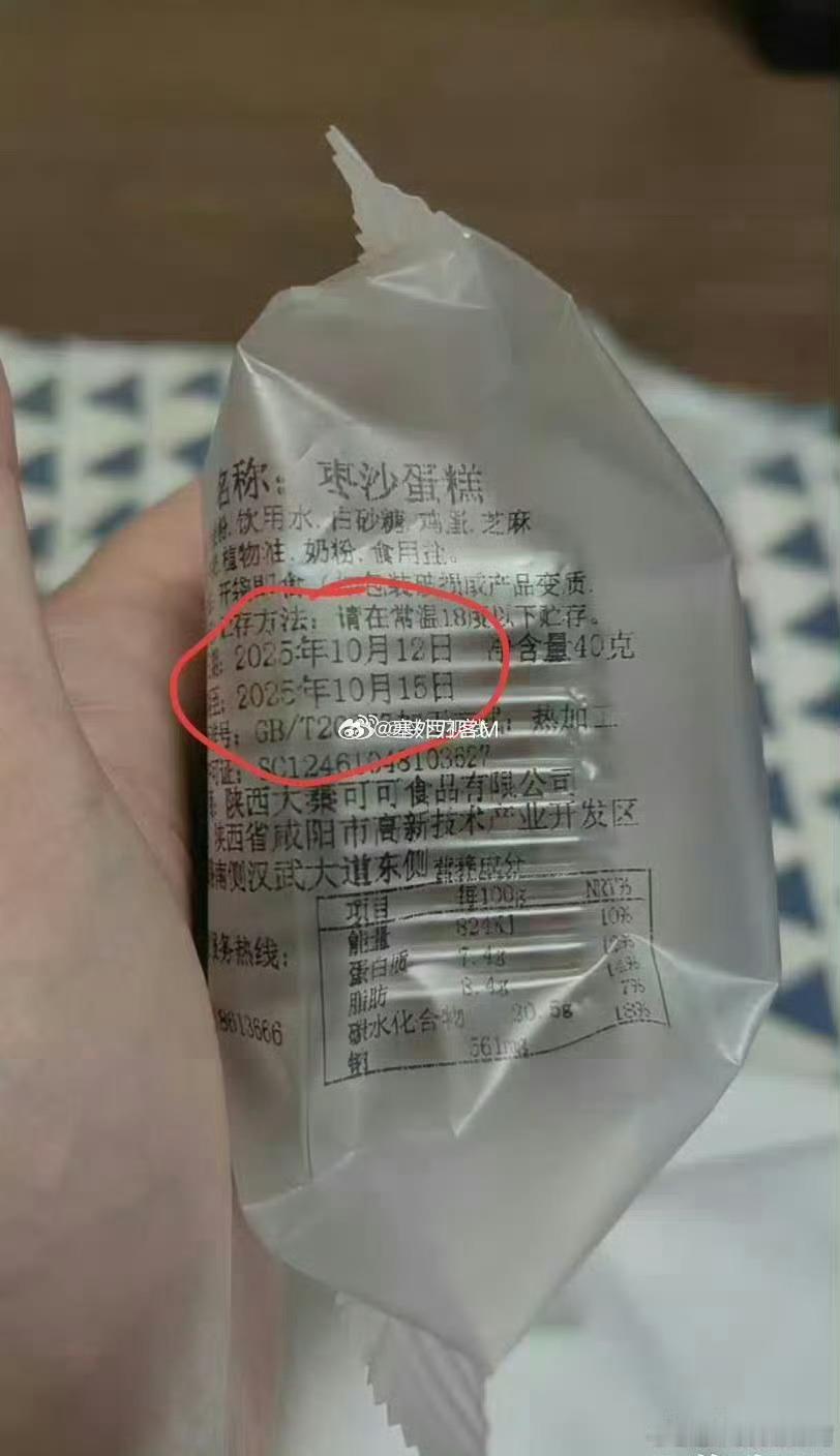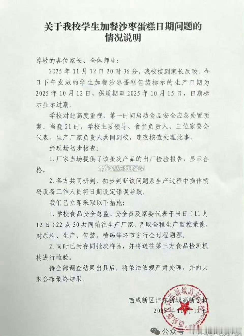 【网友爆料:陕西西咸新区一校学生餐被指出现过期蛋糕? 】当标注着“10月12日生产、10月15日过期”的沙枣蛋糕,在11月12日被发放到学生手中,沣东新城高新学校以“喷码失误”回应,实在难以让家长释怀。难道食品出厂前的自检不含食品包装袋吗?该企业配送的学校还有 西咸新区沣东新城第七学校、西安高新区第五学校,这些学校是否出现同样问题?监管或上级部门应介入调查。