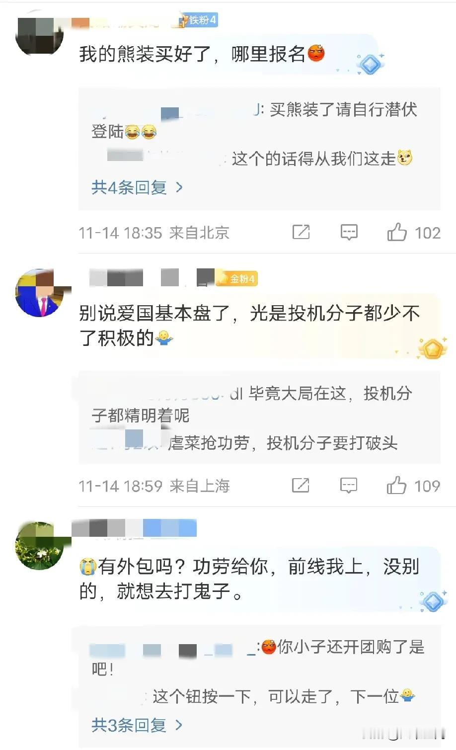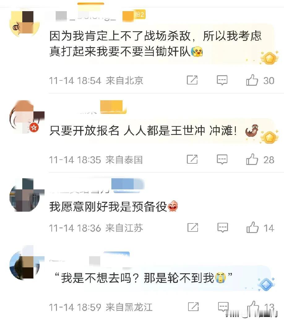 还有精日在阴阳怪气说“打仗你肯报名上前线吗”,这些精日以为大家都跟它们一样贪生怕死,以为大家跟它们一样抱怨自己的国家!如果不是上面按着,多少人就要砸过去了,根本不是不想去,而是根本就轮不到,族谱单开一页,逢年过节享受第一柱香,这种荣誉,大家都抢破头,估计到时候,要靠关系才能上战场杀敌,用剪刀石头去分配敌人!