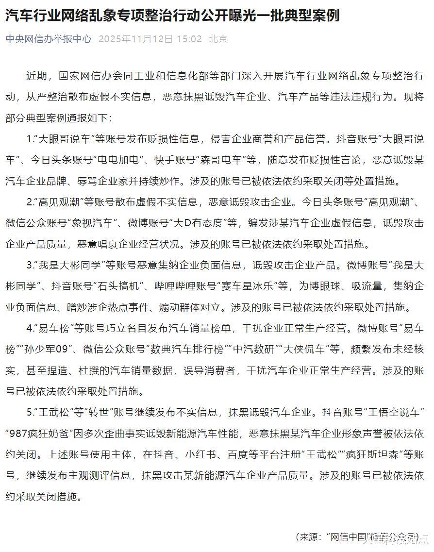 值得注意的是,“王悟空说车”并非首次因恶意抹黑被处理。此前中央网信办在汽车行业网络乱象专项整治中,就已因该账号多次歪曲事实诋毁新能源汽车性能、抹黑企业形象,依法依约将其关闭。这一细节充分说明,恶意抹黑行为不仅触碰企业底线,更早已纳入监管视野,任何试图通过“踩同行”博流量的投机行为,最终都将付出法律代价。这种“司法+监管”的双重约束,正是净化行业舆论环境的关键支撑。