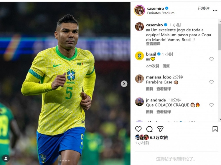 卡塞米罗社媒晒出比赛照片,写道:“全队都表现出色,距离世界杯又近了一步!加油巴西!”