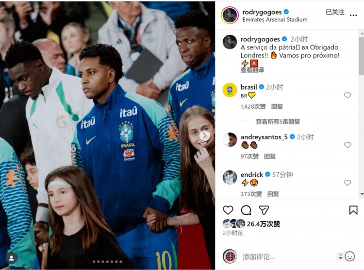 此役罗德里戈为巴西队首发出战,定位球助攻卡塞米罗破门,赛后罗德里戈社媒晒照庆祝胜利,配文:“为国出战,感谢伦敦!专注于下一场比赛!”