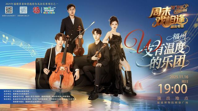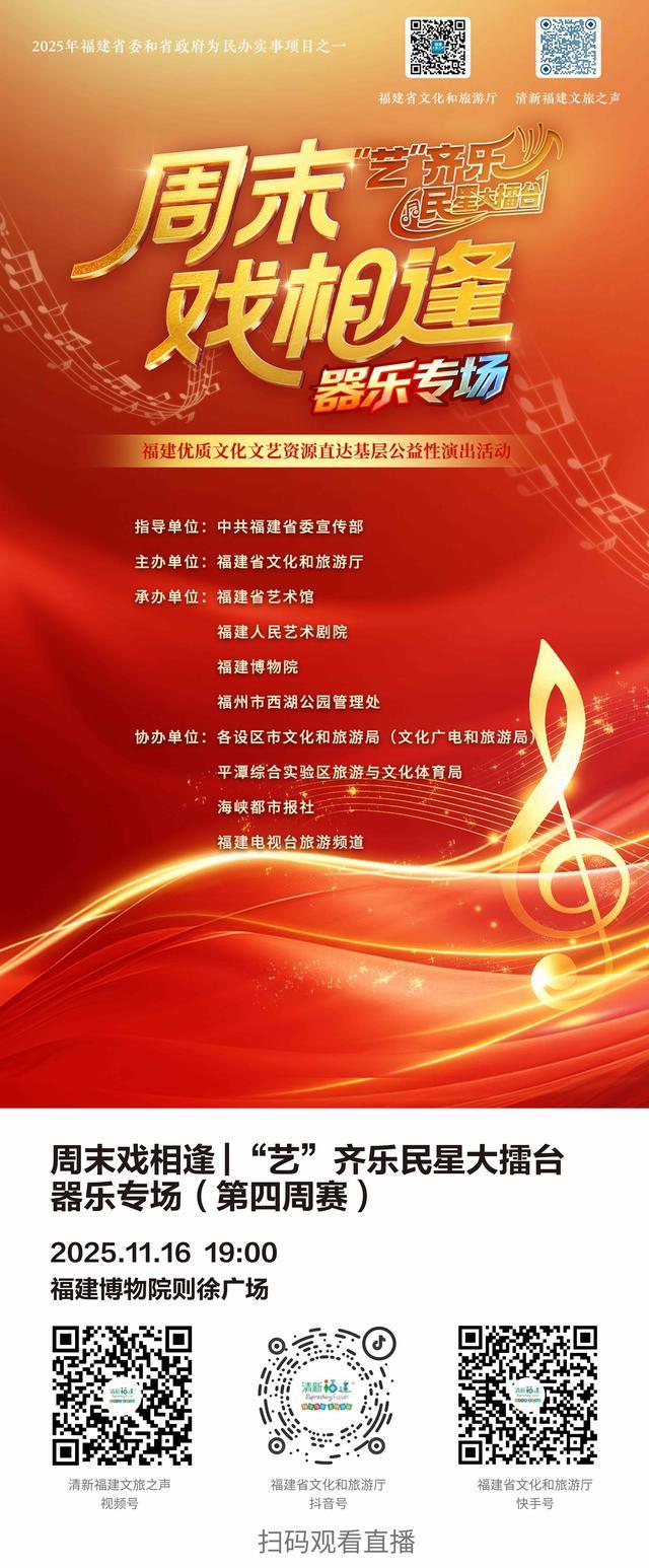 这场融合音乐竞技与民俗艺术的文化盛宴,将于11月16日(本周日)晚7点在福建博物院则徐广场上演。四强乐团蓄势待发,各路群文艺术表演者轮番登场,诚邀大家共赴现场,见证“民星团队”诞生,一同解锁充满韵律与温度的周末之夜!
