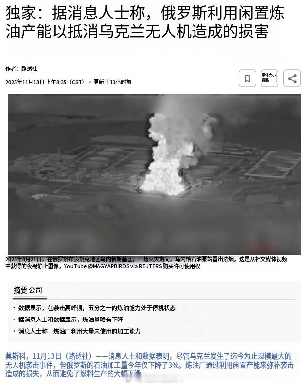 路透社一则令无数大小乌友心碎而绝望的新闻。对于了解俄罗斯炼油能力的人来说,这一点都不令人惊讶。事实上其他富油且炼油能力强悍的国家,其大多数炼油厂不会满负荷运转,除非市场油价极高。每每看着乌友包括许多所谓“中立”简中为乌克兰无人机击中俄国炼油厂储油罐或或欢呼或嘲讽值拉满,“俄国加油站缺油”“俄国人加油站排长队”等等十分好笑。哪怕动动手查一查俄国人有多少座炼油厂,有多少战略储备库。也不至于如此。