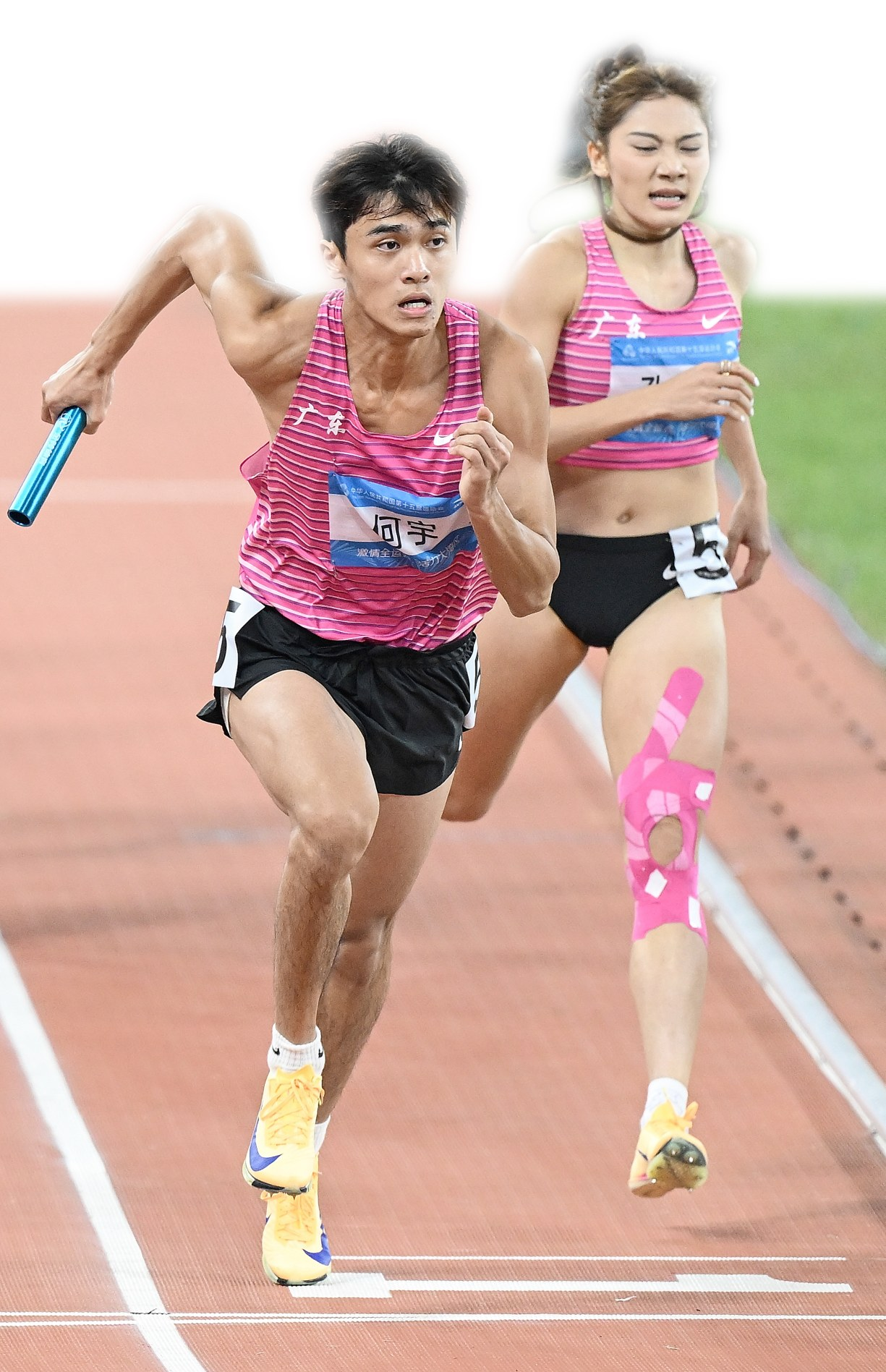 11月15日,广东队选手何宇(左)与孔莹蓥在比赛中。当日,第十五届全国运动会田径4×400米混合接力决赛在广州举行。新华社发