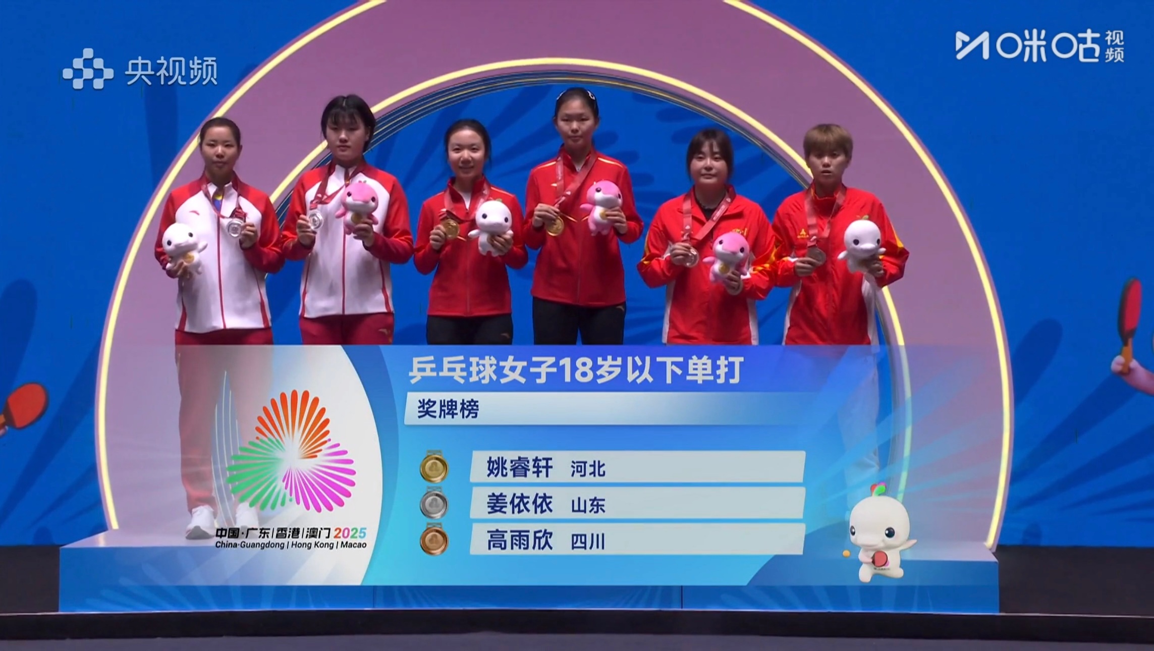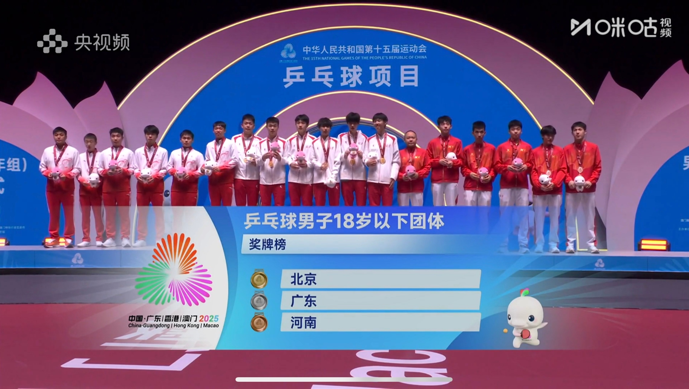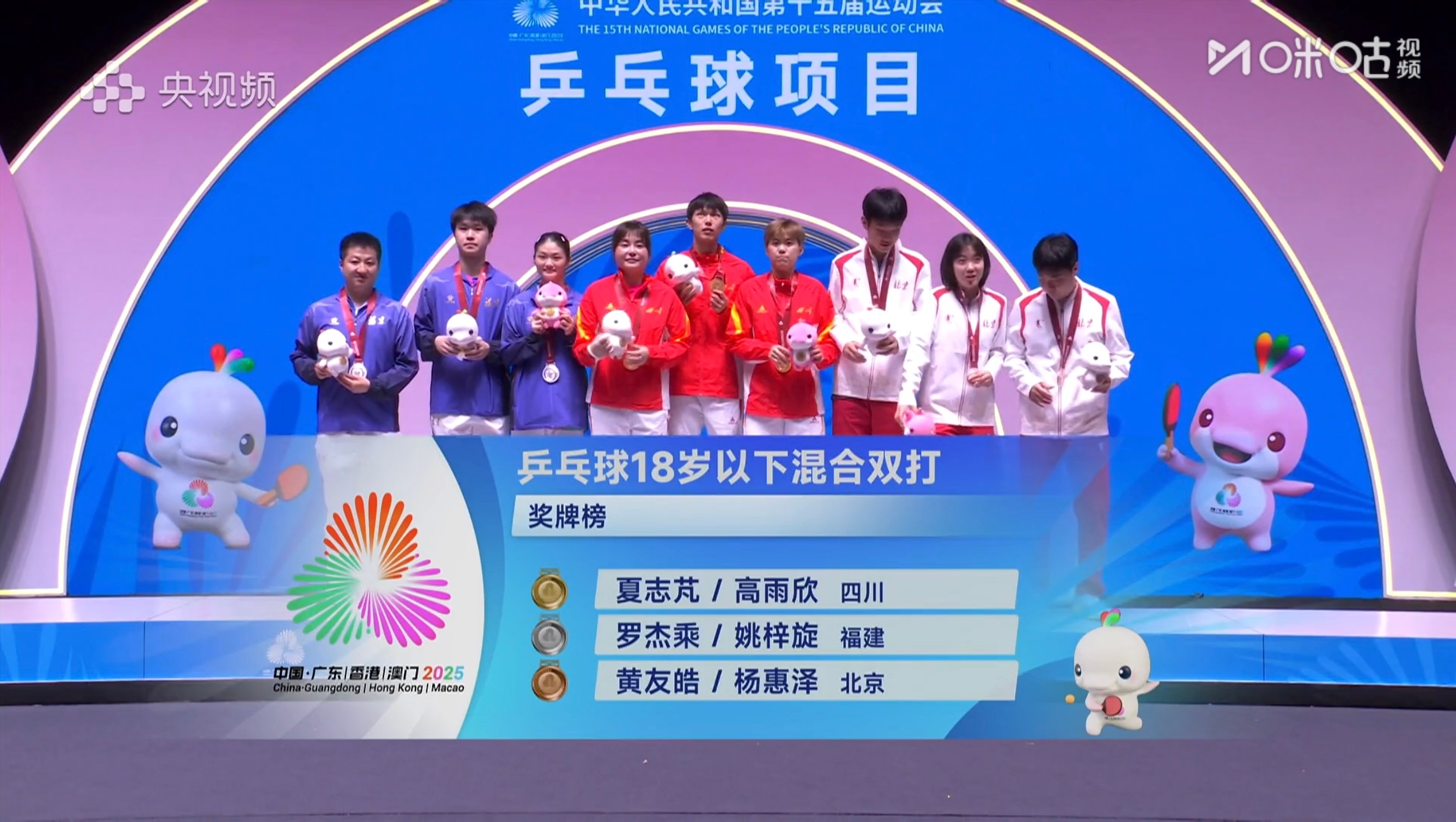 第十五届全运会乒乓球项目青年组各单项奖牌【女团】🥇北京队(刘昕冉、祝启慧、杨惠泽、袁园馨艾、蔡一冉)🥈山东队(丁怡婕、姜依依、王馨雅、崔家祺、刘梓童)🥉河北队(姚睿轩、郭斯予、丁一洋、刘明鹤、何天宇)【男团】🥇北京队(孙杨、陈恒达、黄友皓、华磊、孙炜翔)🥈广东队(龙宇、黄旭男、冯泽华、石俊博、王栋)🥉河南队(温瑞博、李陆同、翟家乐、贾梓翔、信一峰)【女单】🥇姚睿轩(河北)🥈姜依依(山东)🥉高雨欣(四川)【男单】🥇温瑞博(河南)🥈周锦泉(上海)🥉黄友皓(北京)【混双】🥇夏志芃/高雨欣(四川)🥈罗杰乘/姚梓旋(福建)🥉黄友皓/杨惠泽(北京)