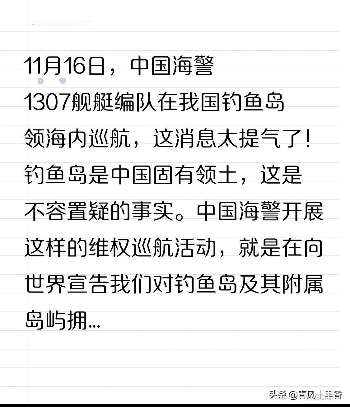 11月16日,中国海警1307舰艇编队在我国钓鱼岛领海内巡航,这消息太提气了!钓鱼岛是中国固有领土,这是不容置疑的事实。中国海警开展这样的维权巡航活动,就是在向世界宣告我们对钓鱼岛及其附属岛屿拥有无可争辩的主权。 海警舰艇一次次在这片海域巡航,就像坚定的卫士守护着家园。这不仅是一种行动上的捍卫,更是一种态度的表达。不管外界有什么杂音,我们对领土主权的维护绝不会有丝毫动摇。为中国海警点赞!