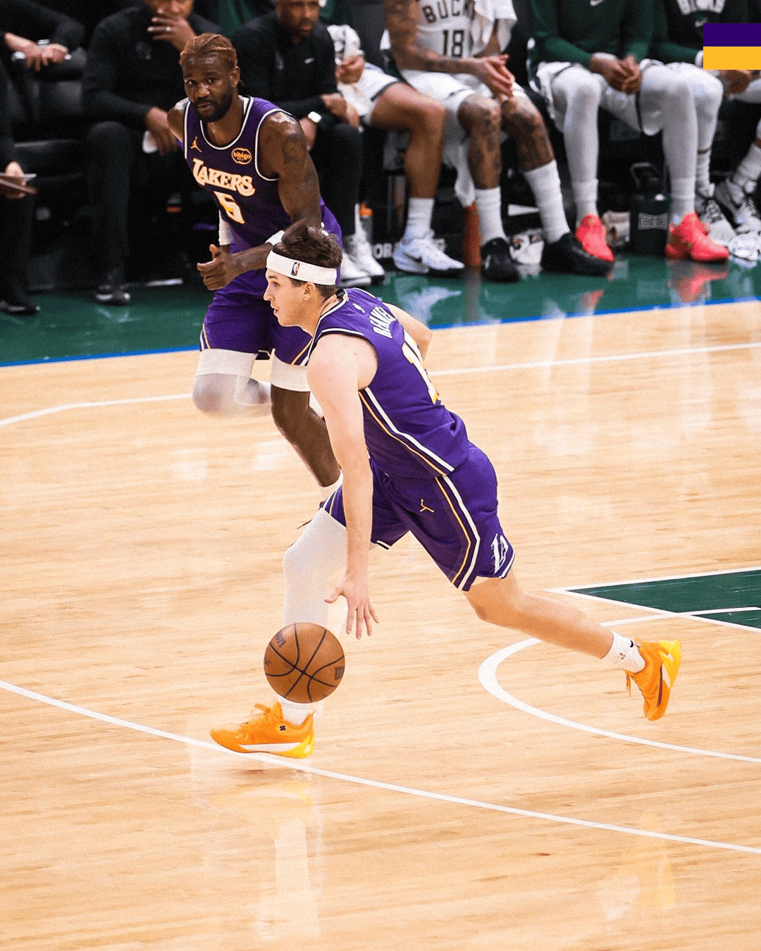 本场比赛,湖人球员奥斯汀-里夫斯全场17中9,三分9中5砍下25分5篮板8助攻,第四节单节独中三记三分稳定军心。