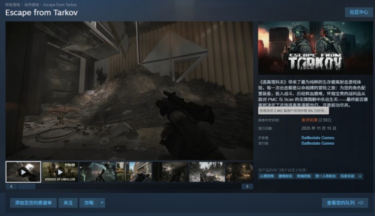 直播吧11月16日讯著名搜打撤游戏《逃离塔科夫》(EscapefromTarkov)1.0正式版现已登陆Steam商店,国区售价242.25元,支持中文。