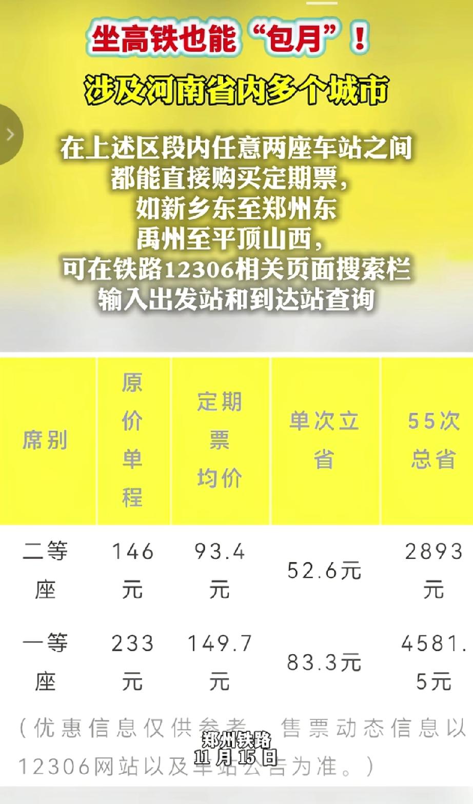 近日中国铁路郑州局集团有限公司针对高频次出行人群,在济郑高铁南乐至郑州东区间、郑阜高铁郑州东至沈丘北区间、郑渝高铁郑州东至郑州东区间、京广高铁安阳东至许昌东区间推行通勤差旅定期票。在上述区段内任意两座车站之间可直接购买定期票,例如新乡东至郑州东、禹州至平顶山西等。可在铁路12306相关页面搜索栏输入出发站和到达站查询。对于经常乘坐高铁出行的人来说,高铁“包月”定期票确实很划算。(来源于@人民网河南频道)