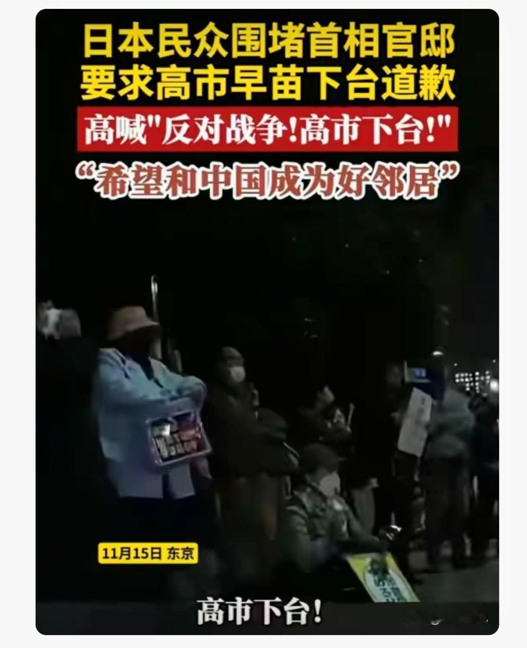 2025年11月15日可太热闹了,东京首相官邸前被抗议人群围得水泄不通。上百名日本民众自发集会,抗议高市早苗的错误言行。他们手持“撤回涉台狂言”“不要战争要和平”的标语牌,高喊“高市下台”“立即向中方道歉”。 抗议人群里有老者、上班族和学生。一位东京市民说只想和中国做友好邻居,不想被首相不当言论拖入风险;还有民众愤怒表示不会外交的人不配当首相。 高市早苗宣称“台湾有事”是“存亡危机事态”,这一言论偏离日本政府谨慎立场,不仅中方反对,日本国内政界也批评不断,小泽一郎就尖锐质问她。看来这高市早苗真是惹了众怒!