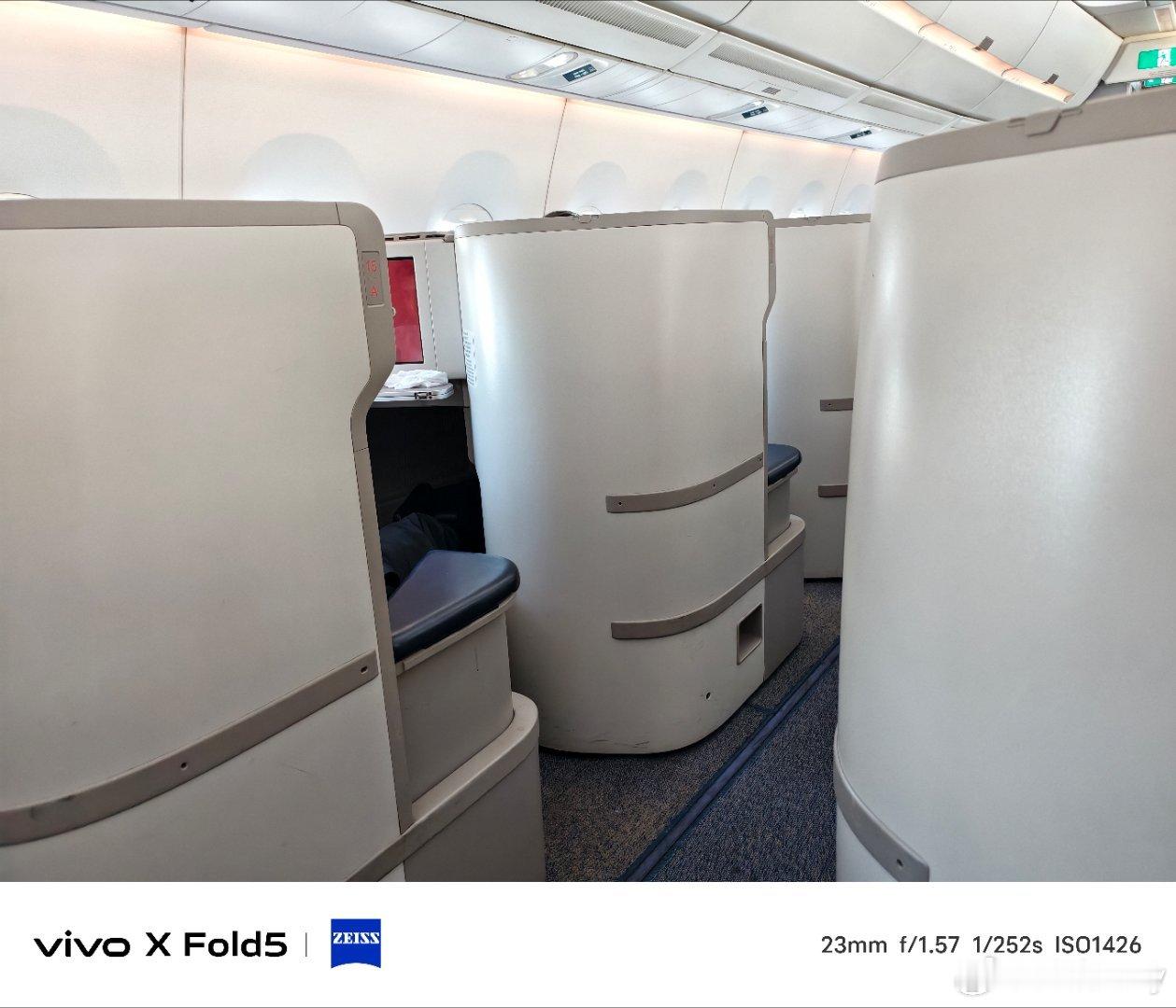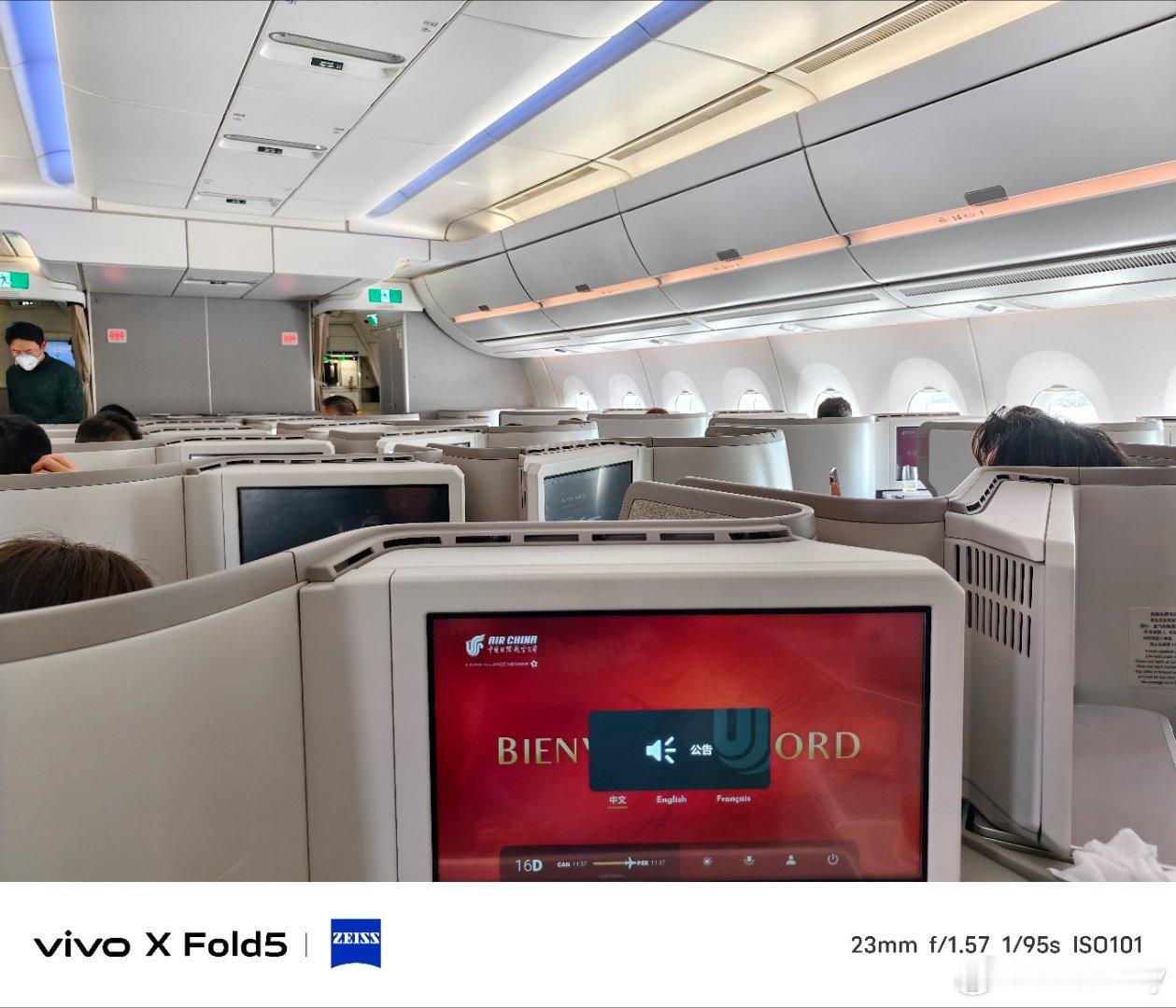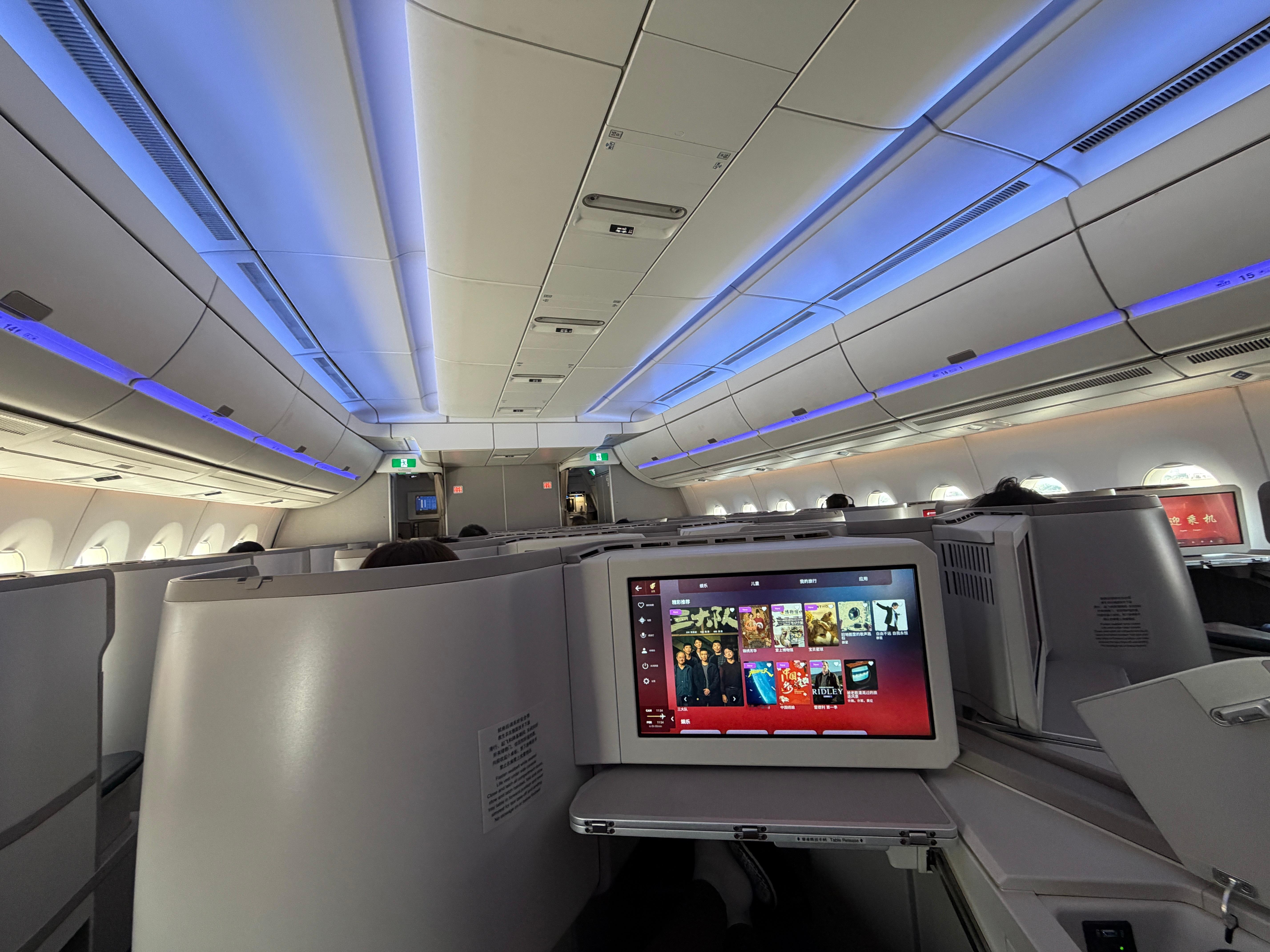 回北京备战广州车展下周再回来今天广州✈北京升舱 机型是空客350-941靠窗位置没了这个商务舱布局是121,靠窗位置是图2这种封闭型的特别舒服。但是中间两排就很尴尬,两个人中间没有围栏或者遮挡物,面面相觑对I人不友好不过挑高2米可以看天花板娱乐系统挺丰富,屏幕挺大,充电接口也都有,2个半小时的飞行可以躺着休息。今天的餐食有前菜三文鱼,正餐肥牛 米粉还有啥我忘了,饮品有日常的饮料,菊花普洱龙井也都能选!最重要的是这趟航班有WiFi 知识点要考:国航的350开头机型大概率都有WiFi 下课!
