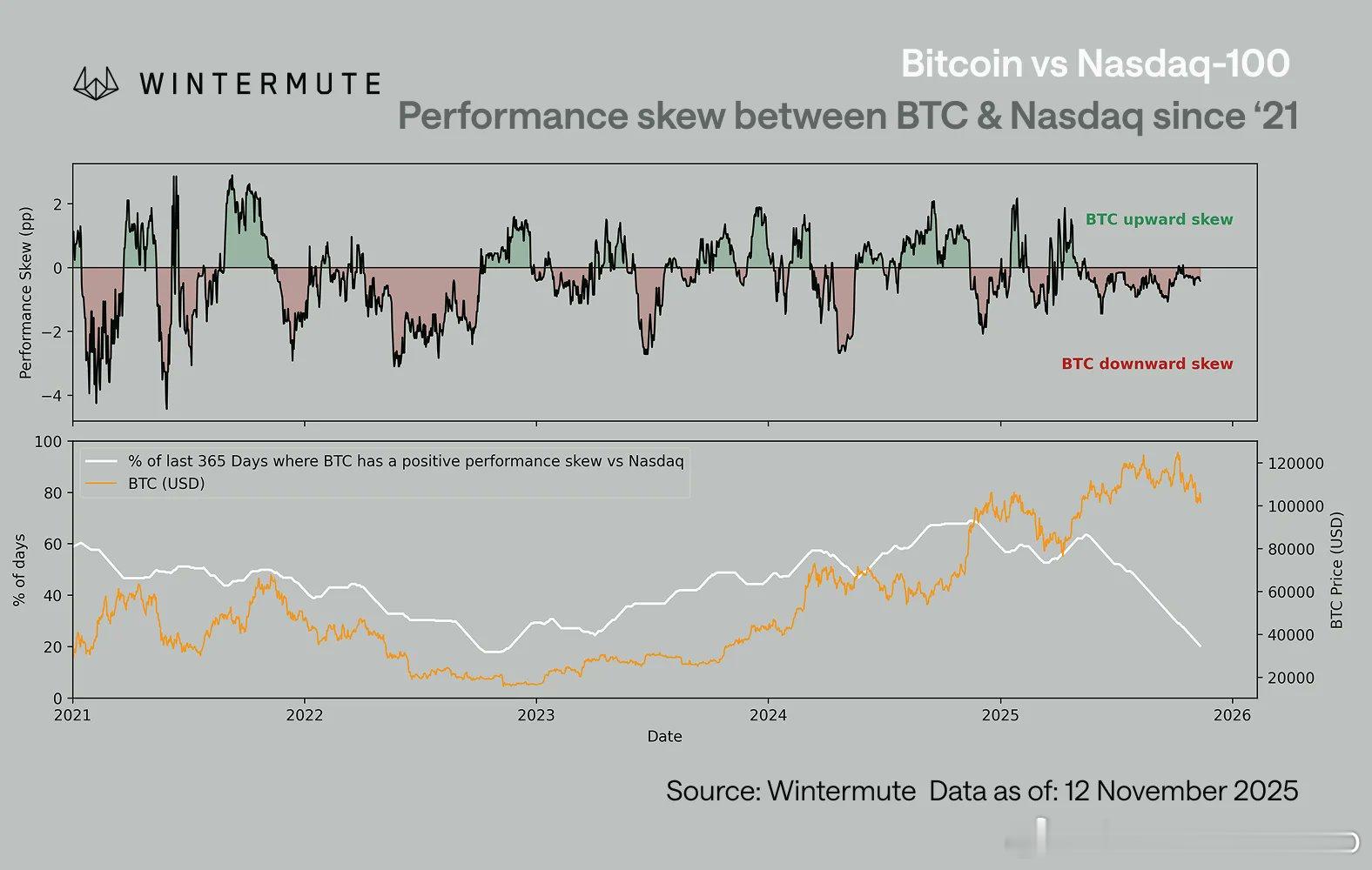 图里SKEW(偏度)指的是BTC相对于纳斯达克100指数表现的偏度它衡量 BTC 在市场上涨和下跌时的反应强度是否均衡正偏度:BTC 在 Nasdaq 上涨日涨幅更大、更领先,显示 BTC 更“激进”地捕捉上涨机会(常见于牛市顶部或乐观期)负偏度:BTC 在 Nasdaq 下跌日跌幅更大、更敏感,显示 BTC 更易受宏观风险拖累(常见于熊市底部或疲软期)负偏度高意味着“痛感放大”——跌得狠,涨得慢。wintermute的这张图表达的意思是:BTC 仍与股市高度相关但这种相关“只在伤人时生效”BTC 对 Nasdaq 下跌更敏感(负偏度极高),却对上涨反应迟钝