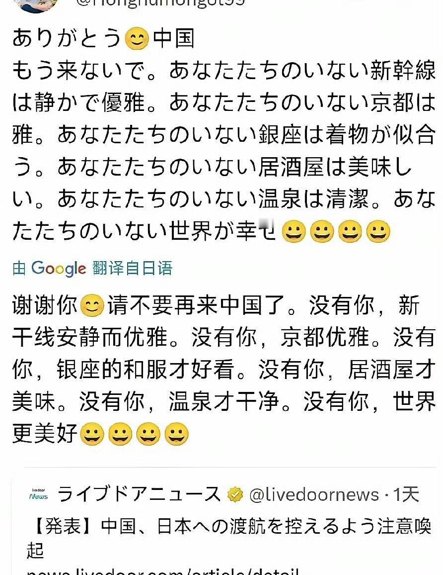 中方发布赴日安全提醒后,日本“强烈抗议完全无法接受,不符合中日推动战略互惠关系,以及构建建设性与稳定双边关系,已向中国提出交涉” 不是说中国游客不去日本,你们会更开心呢?怎么还急了呢,我们去不去是我们的自由,日本很快就要沦为主战场了,还是先操心你们的生命安全吧