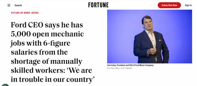 法利表示,福特公司有5000个空缺的机械师职位,但一直未能招到人,尽管这些职位的年薪高达12万美元——几乎是美国工人平均工资的两倍。