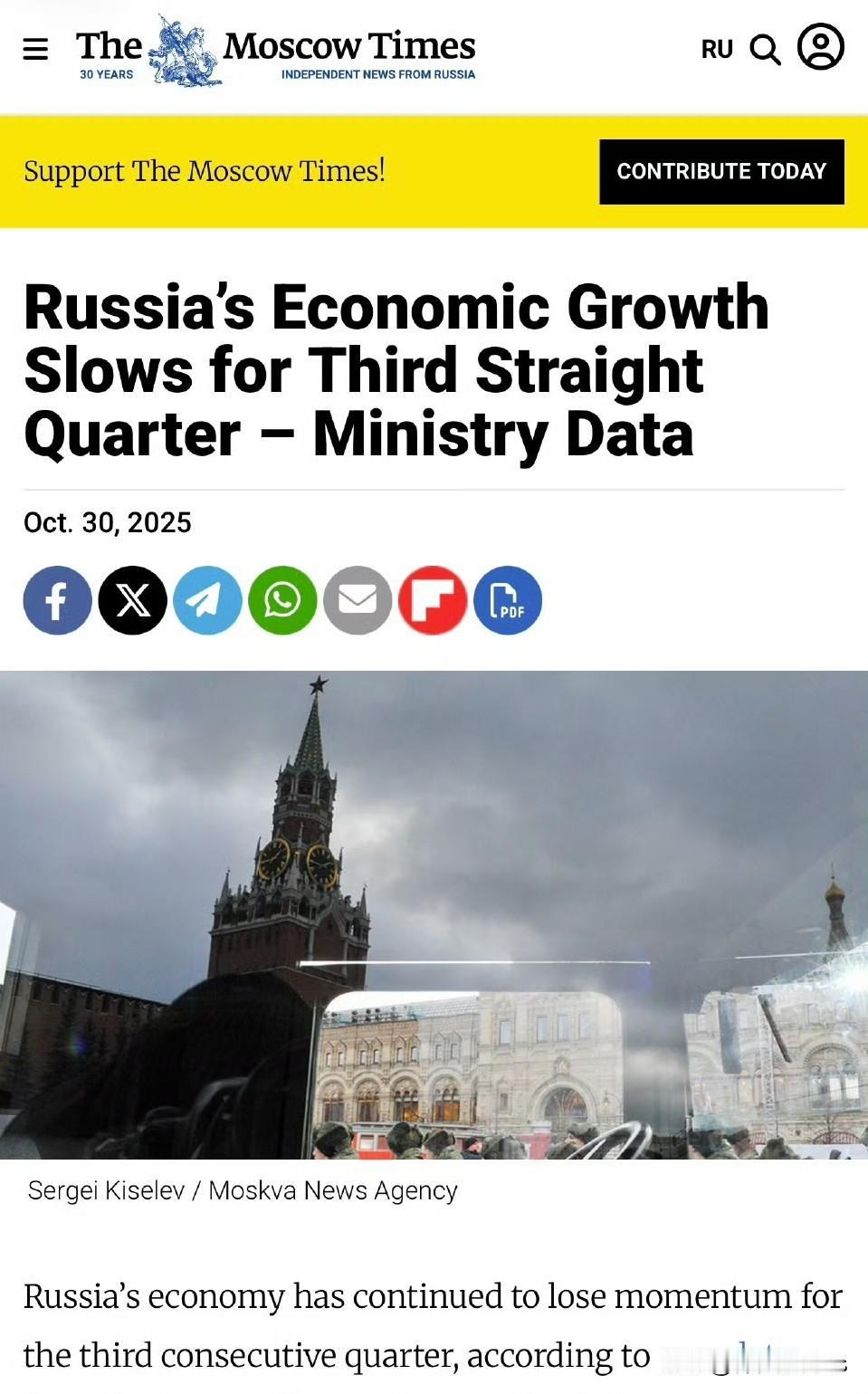 《莫斯科时报》:俄罗斯GDP持续放缓。 俄罗斯联邦统计局证实,经济增长放缓至0.6%。 第三季度,俄罗斯GDP年增0.6%。前三个季度,年增率分别为4.5%、1.4%和1.1%。 经济学家Dmitry Polevoy初步估计,经季节性调整后的季度增长率仅为象征性的0.15%。俄罗斯央行前副行长Sergey Aleksashenko评论道:「GDP持续放缓。」 俄乌战争