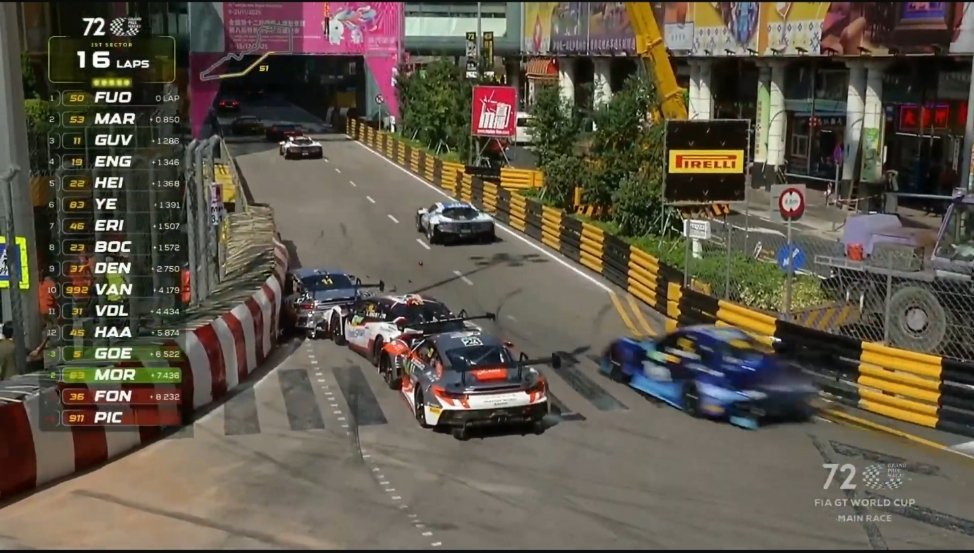 第二起步的叶一飞被后方赛车接连超越掉到第五,“比利时子弹”Alessio Picariello驾驶的911号保时捷赛车和Raffaele Marciello的53号宝马赛车争夺时发生失控导致撞墙退赛。Ayhancan Guven驾驶的11号保时捷赛车在葡京弯撞墙,造成后方Luca Engstler的19号兰博基尼赛车和Dorian Boccolacci的23号保时捷赛车接连追尾