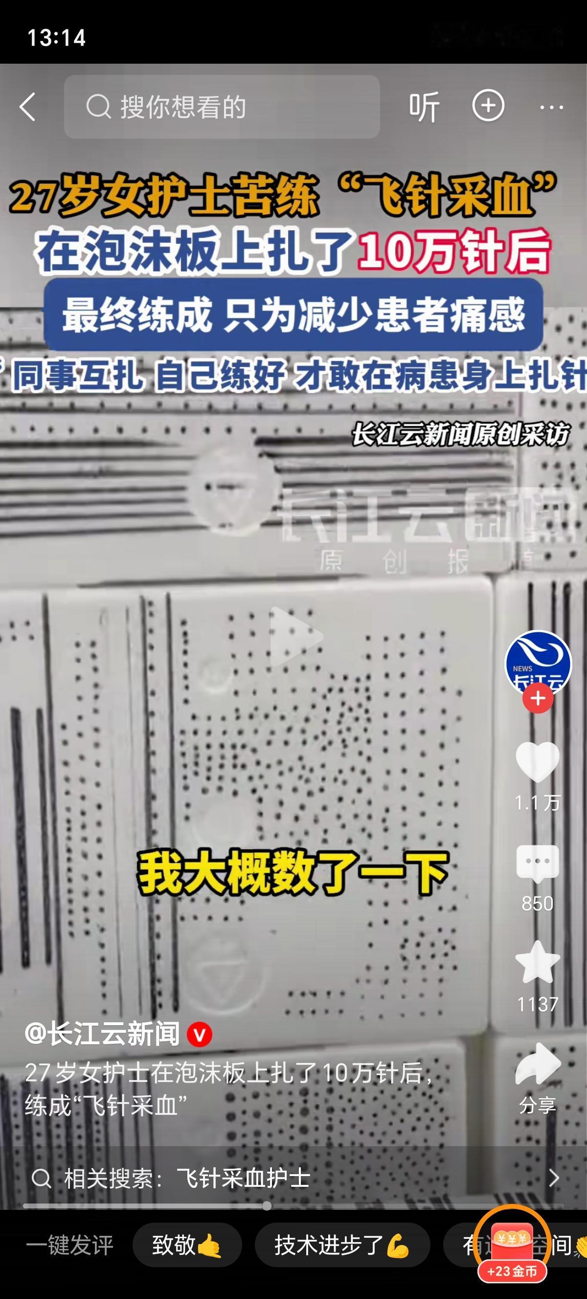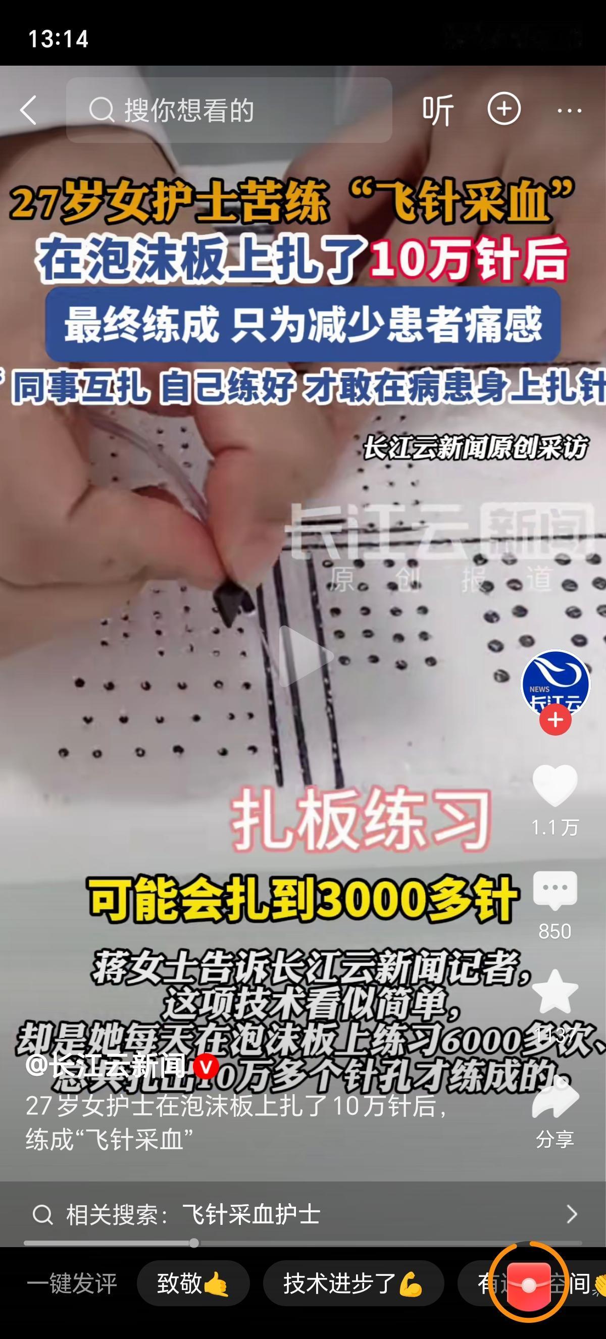 希望所有的护士小姐姐都练就一手“飞针绝技“,最好都有10万针的工作经验。我这种血管细还恐针的最喜欢眼力好、手稳的护士姐姐了,不想老被多扎两三个针眼。 祈祷自己遇到的故事姐姐都是温柔的,手法飞快的,我没反应过来就能采好血的,最好采血时也不要要求我看着自己被采了几管血。 护士的飞针是如何练成的