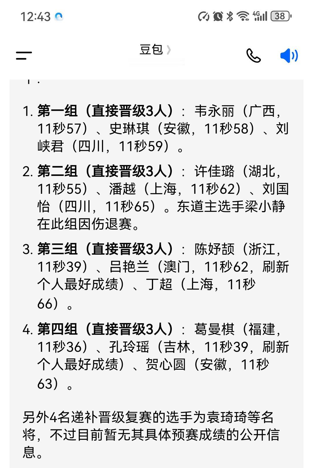全运会女子100米预赛点评 梁小静因伤退赛后,女子100米预赛成绩分3档 第一档,11.3左右 葛曼琪,陈妤颉,孔玲瑶,这三个人曾经或者现在是国家队成员 第二档,11.5左右 韦永丽,刘峡君,史琳琪,许佳璐 上述七人大概率进入决赛。 第三档,11.6左右 就不写名字了,里面有袁琦琦和潘月,是曾经或者现在国家队选手。 11.4左右无人。在这个速度区间,目前只有刘峡君有能力进入,她的PB就是11.43。今年9月在北京创造。 有疑问的是,国家队选手朱俊颖并没有参赛。 综合来看,女子100米冠军大概率是陈妤颉, 陈妤颉夺冠概率是80%。 葛曼琪夺冠概率是15%, 孔玲瑶夺冠概率是5%