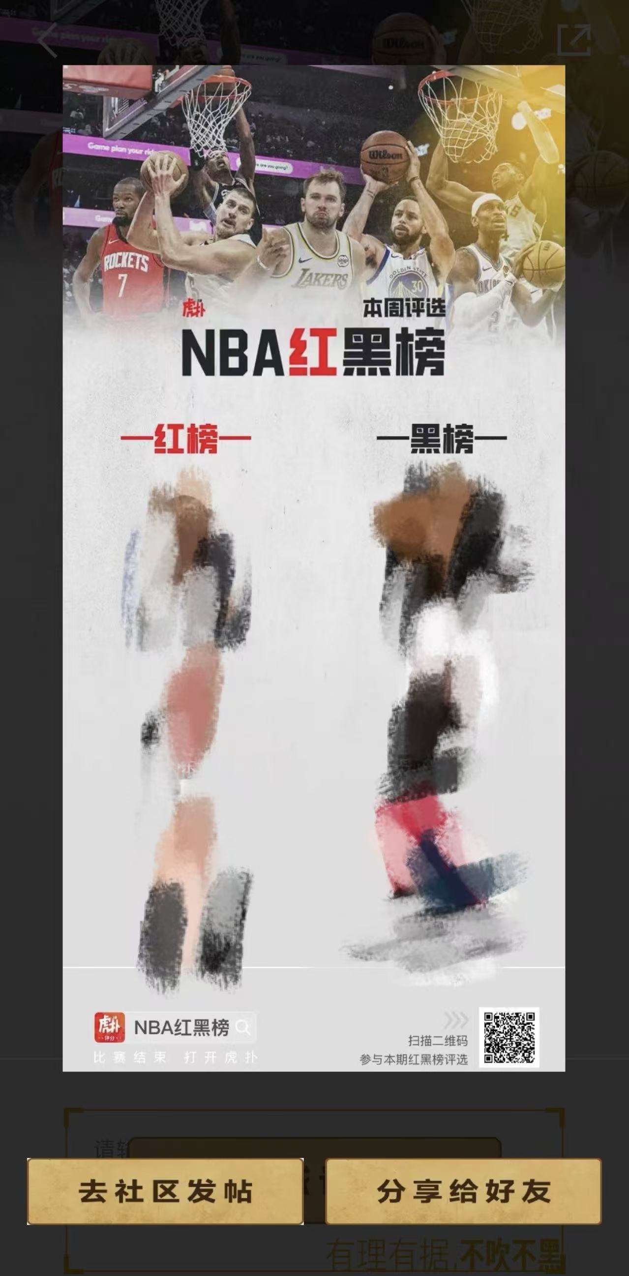 本周NBA常规赛结束,虎扑为各位JR带来本赛季的评选活动:NBA红黑榜评选,我们邀请JRs依据本周球员和教练们的表现,理性客观地评选出三位红榜人选,三位黑榜人选。