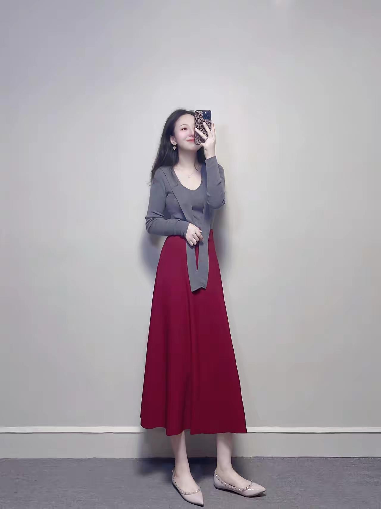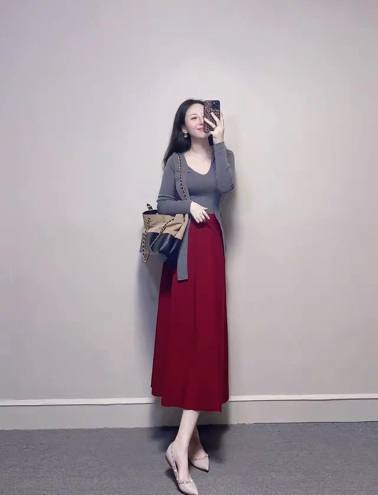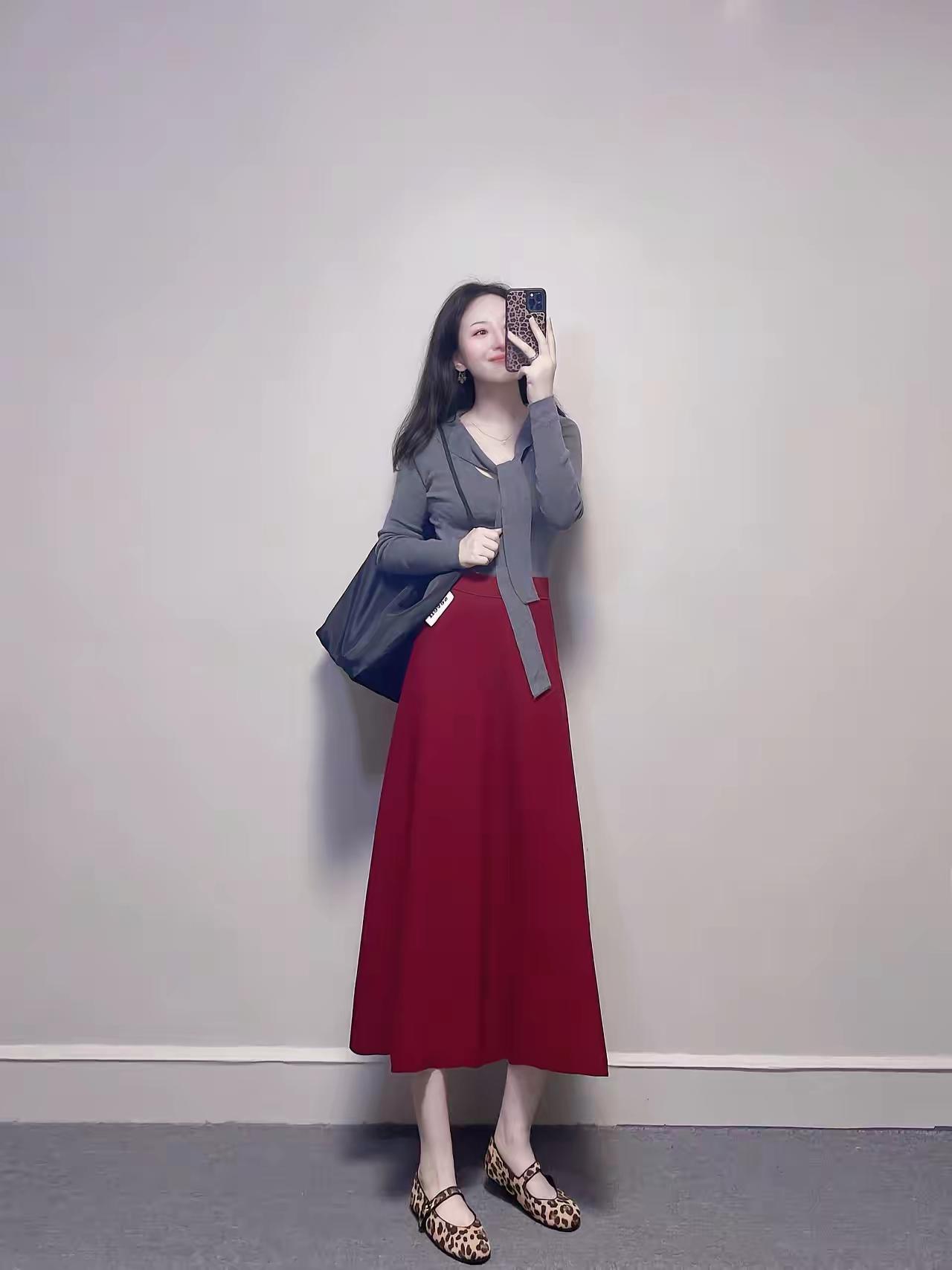 优雅气质穿搭,灰色毛衣+红色长裙,搭配白色高跟鞋,轻松拍出时尚大片!📸✨