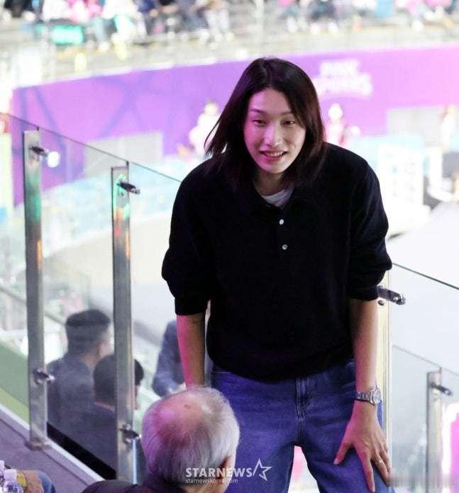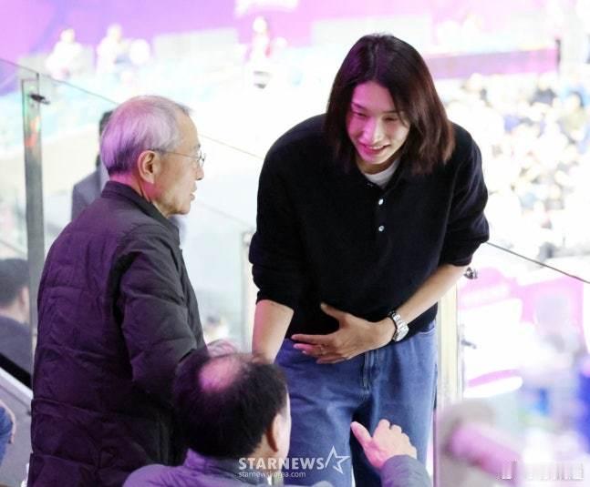 今天兴国生命与正官庄的比赛,俱乐部顾问金软景现场观战,并且还同一位韩国排球界前辈致以问候。