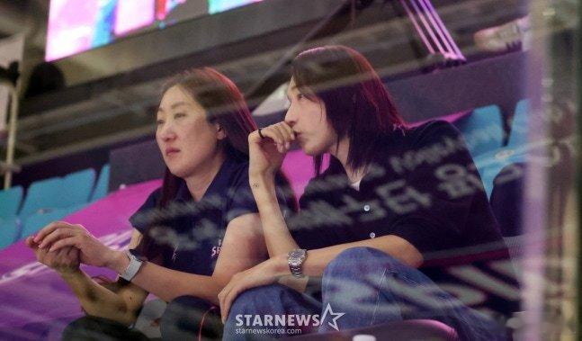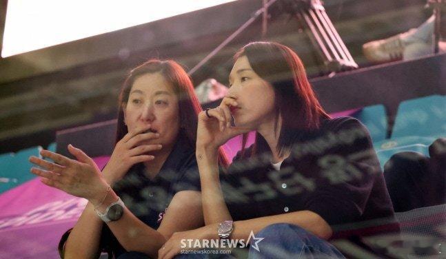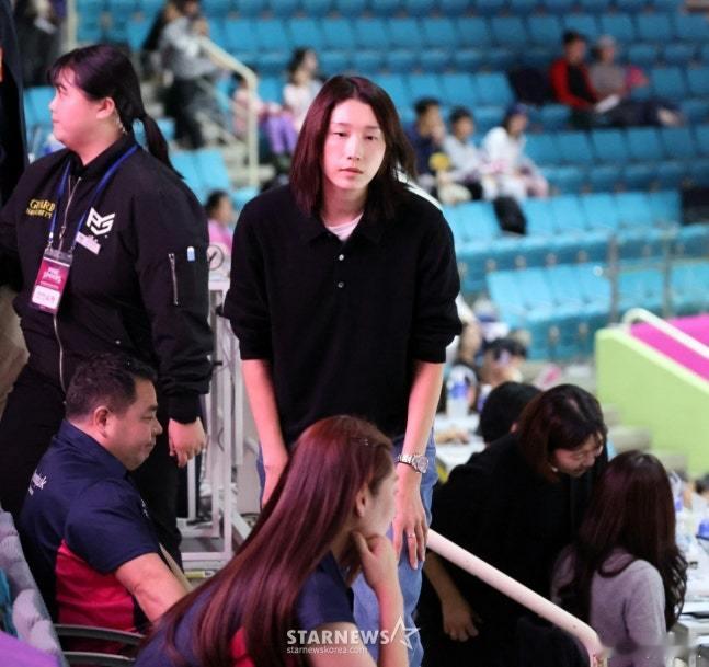 今天兴国生命与正官庄的比赛,俱乐部顾问金软景现场观战,并且还同一位韩国排球界前辈