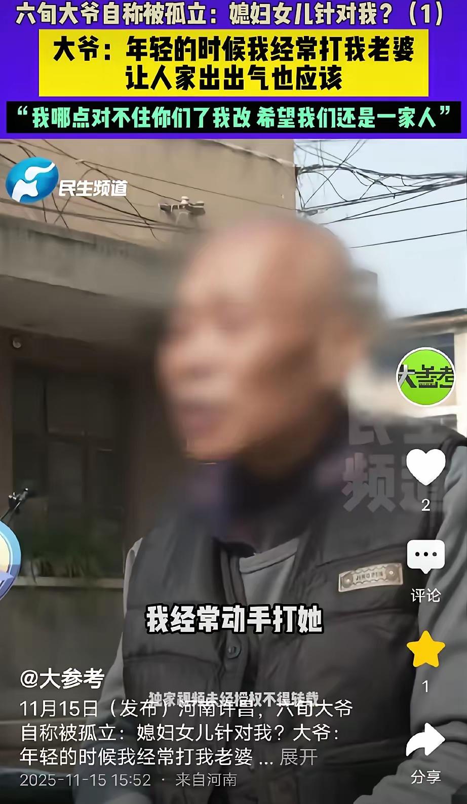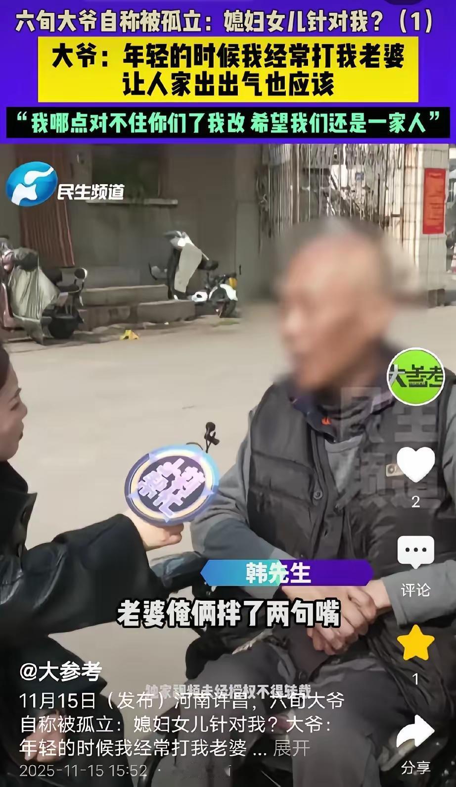 这个案例反映出家庭暴力带来的深远伤害和复杂的家庭关系,也引发了公众对家庭暴力、赎罪与宽恕的思考。以下是一些观点和分析: 家庭暴力的严重危害 韩大爷年轻时的家暴行为明确符合家庭暴力的定义,造成了妻子和女儿的长期身体和精神创伤。 家暴不仅伤害了受害人,也破坏了整个家庭的信任与和谐。 迟来的反思与赎罪 韩大爷在晚年表达了悔意,希望得到理解和原谅,但这是否能弥补过去的伤害,是值得深究的问题。 “知错能改”固然重要,但暴力的根源早已埋下难以愈合的伤口。 家庭责任与尊重 作为家庭成员,应以尊重、理解和共同努力维护家庭幸福。暴力和冷漠只会让家庭关系雪上加霜。 子女对父亲的憎恨和反感,源于多年家暴带来的心理阴影,这难以用简单的道歉或赔偿来弥补。 法律与社会的保护 反家庭暴力法明确规定对家庭暴力零容忍,提醒人们重视家庭成员的权益和安全。 公众应增强家庭教育与法律意识,预防家庭暴力发生。 伦理与公益反思 亲情、责任与宽恕虽然重要,但当家庭暴力成为惯性行为时,宽恕可能并非解决根本问题的办法。 社会应关注家庭暴力的预防和心理疏导,为受害人提供有效的帮助和保护。 总结: 这个案例提醒我们,家庭中的暴力行为会造成无法弥补的伤害,晚年的后悔和委屈无法代替过去的伤痛。修复家庭关系需要真诚的认错、持久的努力和专业的心理支持,而不是简单的道歉或媒体曝光。每个人都应努力营造一个安全、尊重和充满爱的家庭环境,这才是对每个家庭成员最好的守护。 您怎么看?家暴违法行为 家暴定罪
