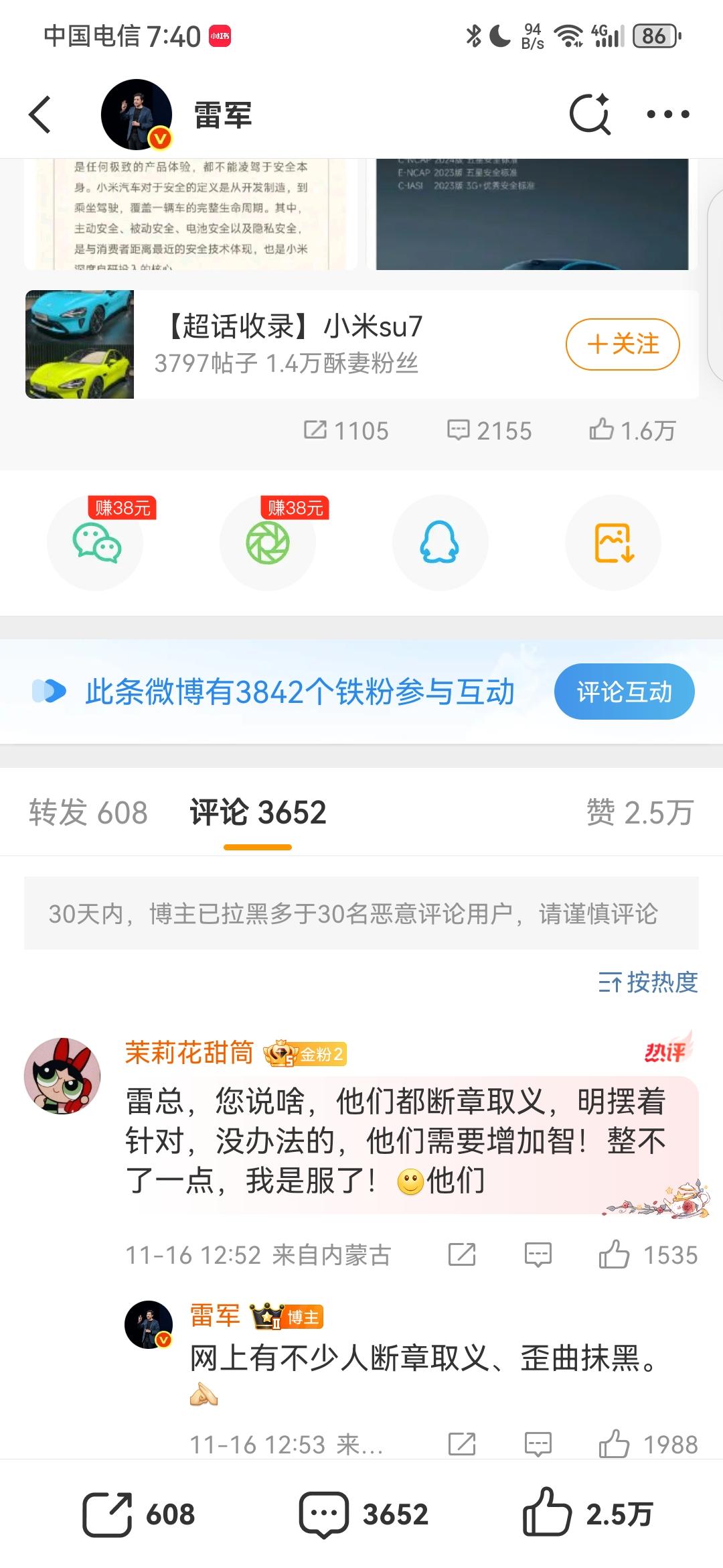 雷军今天(11月16日)罕见在微博发火,直接毫不客气质问道:“在去年4月的一次采访中,我在谈产品定义时说,“一辆车,好看是第一位的”,这和“安全是基础、安全是前提”矛盾吗?还是在这次采访,我谈设计时候说轮毂最难设计,这有啥问题?” 事情起因应该是这段时间与小米有关的争议越来越激烈,已经渐渐形成了一股巨大风潮,尤其是前两天(11月14日)经济观察报与第一财经更是发布了一篇万字长文报道“小米之惑”,其中将与小米有关的几乎所有问题都集中、系统的梳理了出来,使得与小米有关的争议,达到了一个更高的层次。 雷军在微博一直都是一个情绪非常稳定的情况,除了宣传小米产品、分享分享自己的生活状态,几乎不会涉及到其他内容。今天这一条微博,是他极为罕见的一次发火,以反问句的形式直接质问:“我谈设计时候说轮毂最难设计,这有啥问题?”由此可见,最近这段时间与小米有关的争议,的确是给雷军造成了不小的压力。 雷军同时更是强调,他之前是多次强调过汽车的安全问题,这与看重汽车设计并不矛盾,而且他也曾多次在微博表达对汽车安全的看法,并将之前发的表达对汽车安全看法的微博都翻了出来,集中展示给了大家,这也是他对最近这段时间许多争议的一个解释。 雷军认为很多批评其实都是断章取义。 不可否认,雷军说的也有一定道理,因为的确很多对小米的批评是断章取义,但小米自身也的确是有一些问题。雷军是一个很认真的企业家,还是希望他能吸取教训,改正问题,挺过这一次困难。