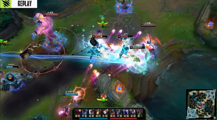 [11:48]中路混战,Lele蒙多无人能挡进场双杀,Cryin烈娜塔大招铺三人,米勒奥恩晚来一步,WEG打出0换2。