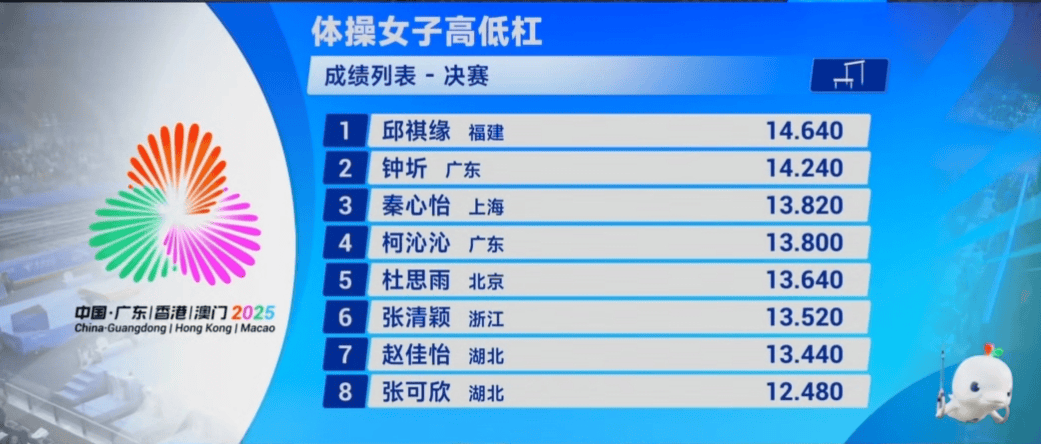 全运会体操女子高低杠决赛:邱祺缘14.640夺金,钟圻获银