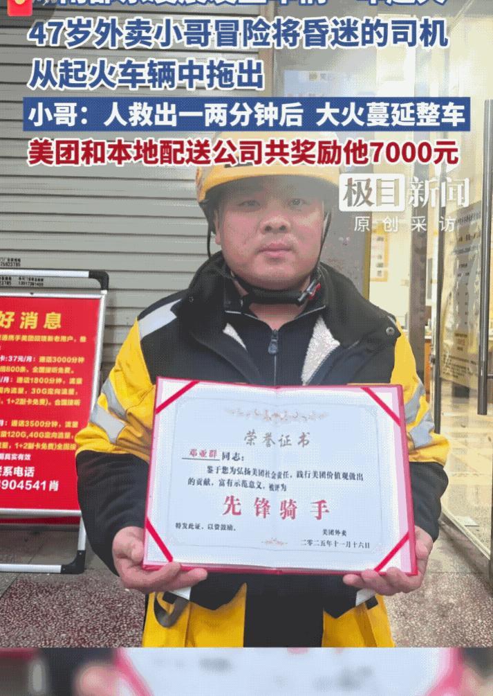 美团骑手勇救车祸事故司机,奖金直逼民警辅警二等奖,累计已发放超过600万元。事发11月16日凌晨0点40分,在湖南省邵东市某街道发生一起两车相撞的车祸,其中一车车头已起火。 其中奔驰车司机下车后受伤坐在路边,另一起火车上人员疑似昏迷。正在这时,一名47岁的美团外卖骑手邓亚群正好路过,他二话不说,询问奔驰车主是否需要帮忙,得知还有人在车上,他立刻冒险将起火车辆中昏迷的驾驶员抱出并再次确认两车上没有人员。 事发救人完后他就离开了,自己都不知道英雄事迹被其他外卖员拍摄发了抖音,第二天他救人的事迹就被所在站长上报了美团“先锋骑士”,很快就确认了他的英勇行为。美团公司为其发放了5000元奖金加证书和账号称号(据说有优质单推送权),同时站点也给他发放了2000元特殊奖。 有网友称,美团这两年终于良心发现了很多举措都获得骑手和用户的好评。据了解美团已累计选出1100多名先锋骑手称号人员,发放近600万元。还有网友称,很多地方辅警二等功也才5000元奖金,美团真是一家好公司。 美团骑手冒险救人获得7000元奖金 47岁外卖员凌晨救起火车辆司机第二天获大奖 美团先锋骑手奖金直逼辅警二等功