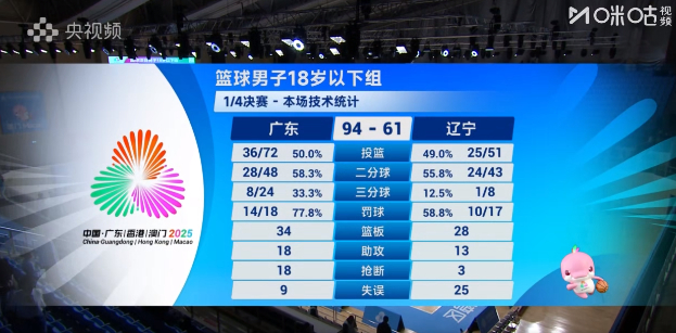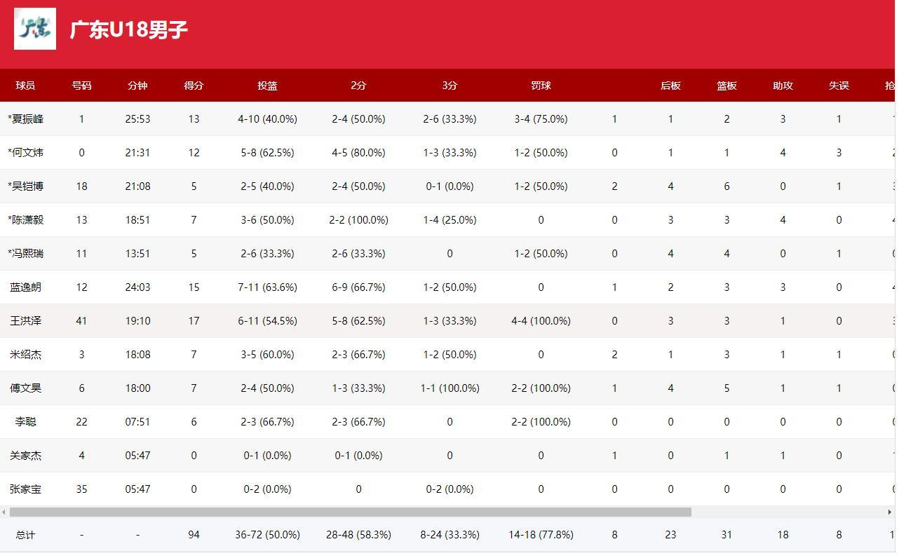 U18男子组淘汰赛广东vs辽宁的比赛结束了,广东u18男篮以94-61战胜辽宁U