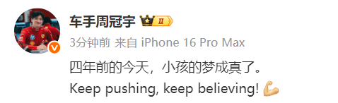 周冠宇更新社媒回忆了这一历史时刻,他写道:“四年前的今天,小孩的梦成真了。”