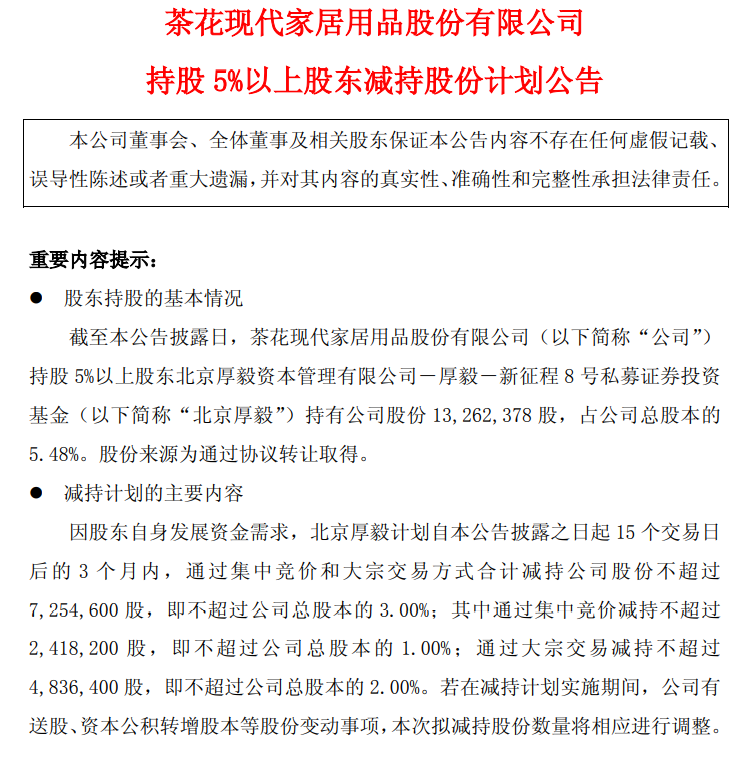 11月16日,茶花股份(603615.SH)公告,公司股东北京厚毅资本管理有限公司-厚毅-新征程8号私募证券投资基金(简称“北京厚毅”)计划自本公告披露之日起15个交易日后的3个月内,通过集中竞价和大宗交易方式合计减持公司股份不超过725.46万股,即不超过公司总股本的3.00%。