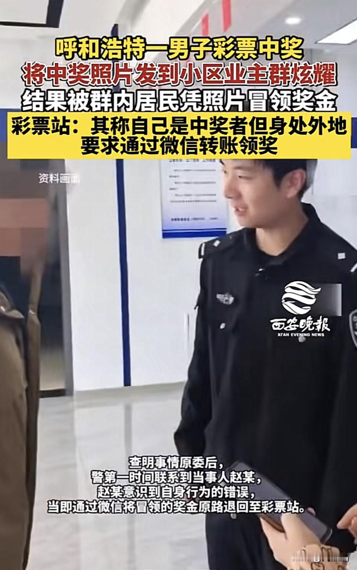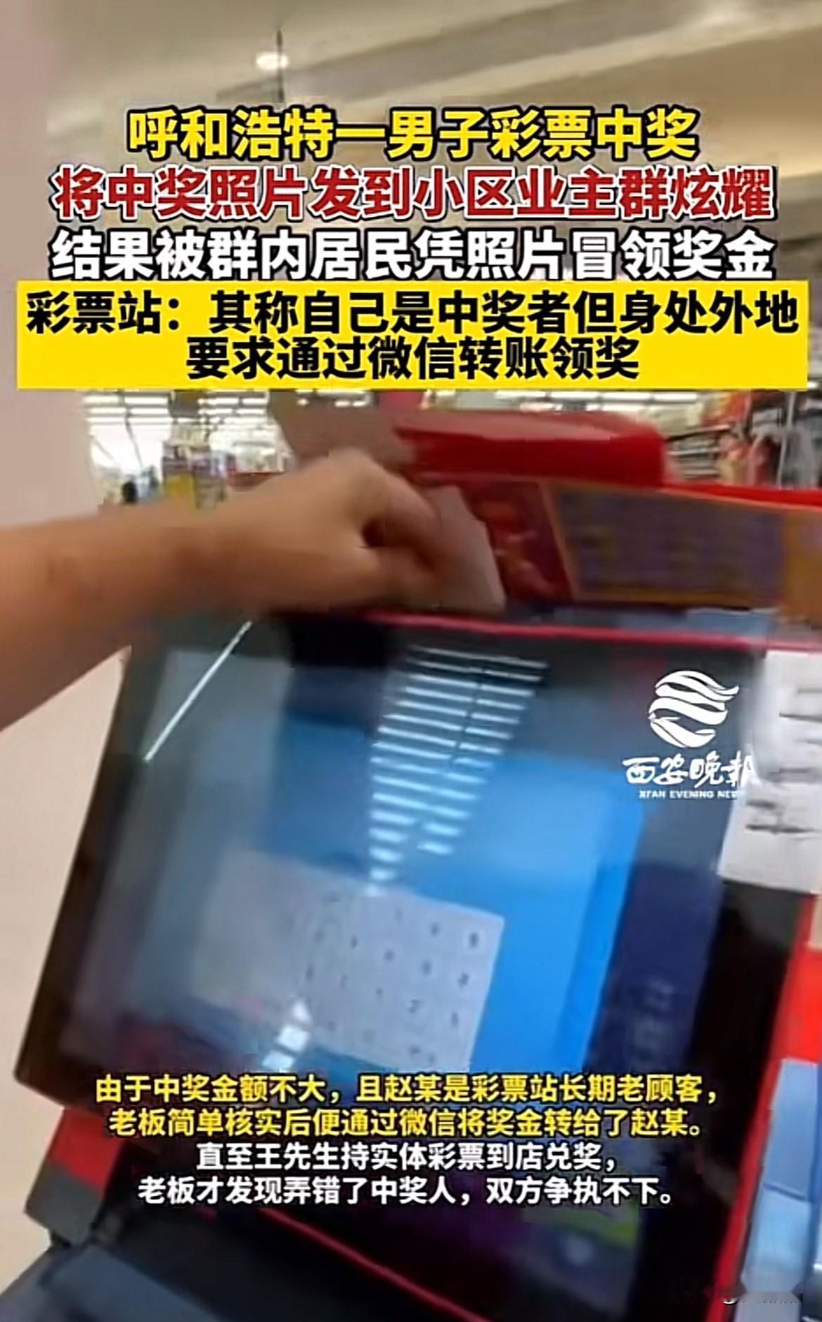 好不容易中个彩票,去领奖却被彩票站老板告知兑换不了,警方一查竟是王先生自己导致的。 11月11日晚,王先生确认自己中了彩票,欣喜若狂,拿起彩票就拍照发到小区群炫耀一番。等12日去彩票站兑奖时,老板告知这彩票已经兑过了,问“你在彩票是哪里来的?” 王先生怒了,“我这彩票是你这里买的,怎么兑不了,怎么中奖了就不认了吗?” 双方争执不下,于是报警。警方通过调查核实,原来是小区业主赵某冒领了。赵某是彩票站老彩民,11日当晚看到王先生发出来的图片,心生歹念,微信联系彩票站老板,说“我在异地,微信这个图片可以兑换彩票吗?”,由于中奖金额不大,老板简单核对后微信给赵某转账过去了。 直至王先生拿着实体彩票到店才撞破赵某的谎言。所幸在民警协调下,王先生拿回了属于自己的彩票奖金。 财不外露,富不外宣。你中奖就自己偷着乐好了,分享出去美其名是让别人沾沾运气,其实是炫耀。
