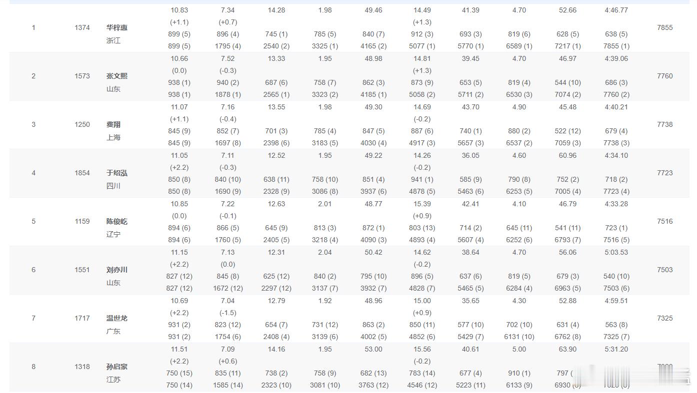 全运男十项全能华梓惠气势如虹一路领先夺冠 费翔险重现亚锦赛奇迹终摘铜11月16日晚,全运田径大项结束男子十项全能的全部比赛。上届季军、浙江选手华梓惠,虽然十个项目里只有铅球排名首位,但他保持了最好的均衡性,从第六项110米栏过后,一路保持领先,最终以7855分获得冠军。山东选手张文熙,开场100米跑出10秒66拿到938分气势如虹,在比赛前半段也保持对华梓惠的微弱领先。后半段被华梓惠反超后,张文熙虽然试图逆转,但在第九项标枪一项输给华梓惠多达140分之后,失去最后机会。张文熙以7760分获得亚军。今年亚锦赛冠军、上海选手费翔,上演和亚锦赛类似的场景。开场100米发挥不利,仅列第九。随后费翔慢慢追赶,提升排名。第八项撑杆跳之后费翔升到第二位。但他同样在标枪上失风,最后以7738分获得季军。上届全运会冠军、江苏选手孙启豪以7323分获得第八名。