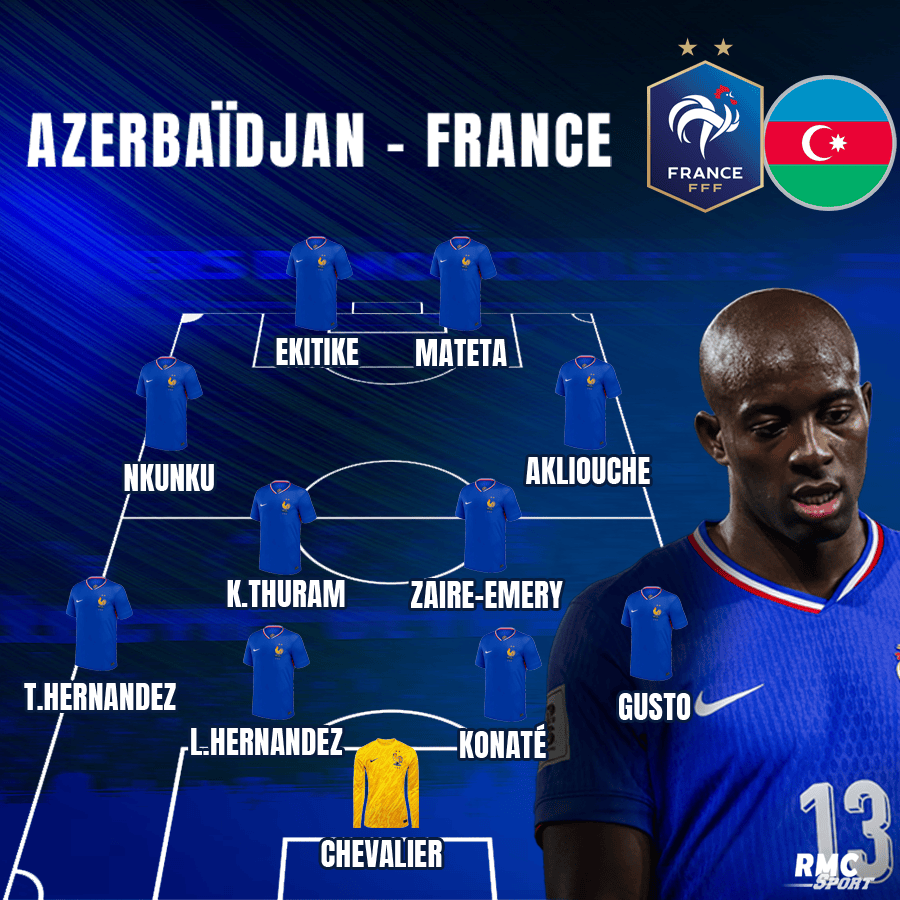 法国队首发:23-舍瓦利耶、2-古斯托、15-科纳特、21-卢卡斯-埃尔南德斯、22-特奥-埃尔南德斯、18-扎伊尔-埃梅里、6-凯夫伦--图拉姆、12-阿克利乌什、7-恩昆库、19-马特塔、9-埃基蒂克