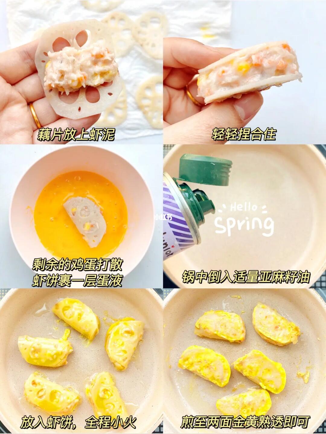 5⃣️锅中倒入亚麻籽油,将虾饼裹一层蛋液,小火慢煎,煎至两面金黄即可。不加盐也敲好吃,一定要试试❗️