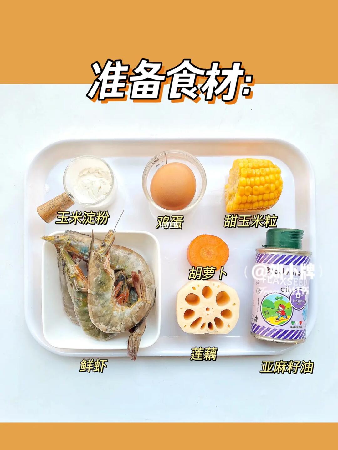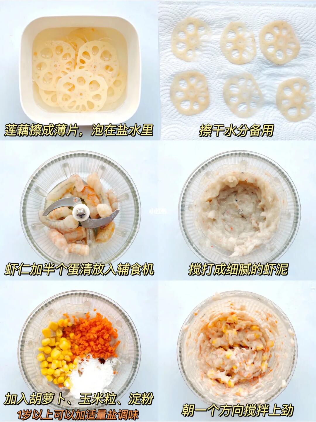 2⃣️胡萝卜、玉米粒焯水煮熟,切碎倒入虾泥中,再加一勺淀粉,一岁以上适量盐调味。🌽玉米粒根据宝宝的月龄来处理,小宝宝可以切碎一点。